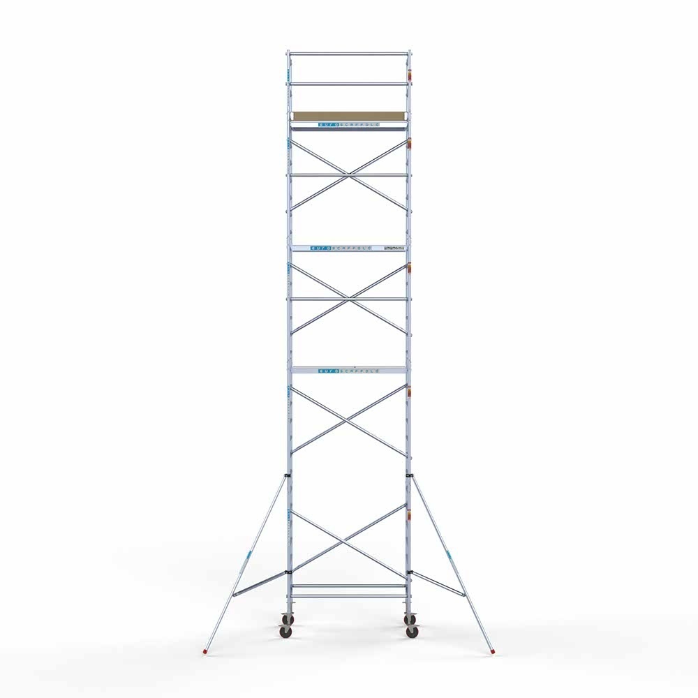 Deze steiger voldoet niet alle verplichtingen voor professioneel gebruik en mag hierdoor ook niet zo aangeboden worden (een platform minder). De rolsteiger heeft een draagvermogen van 250 kg per platform en 750 kg per steiger. De rolsteiger wordt geleverd met alle benodigde onderdelen, zoals frames, schoren, wielen, borgclips en stabilisatoren. Daarnaast beschikt de Basis rolsteiger van Euroscaffold nu ook over een basis-voorloopleuning. Hiermee bouwt u de rolsteiger extra veilig op en werkt u veilig op hoogte.