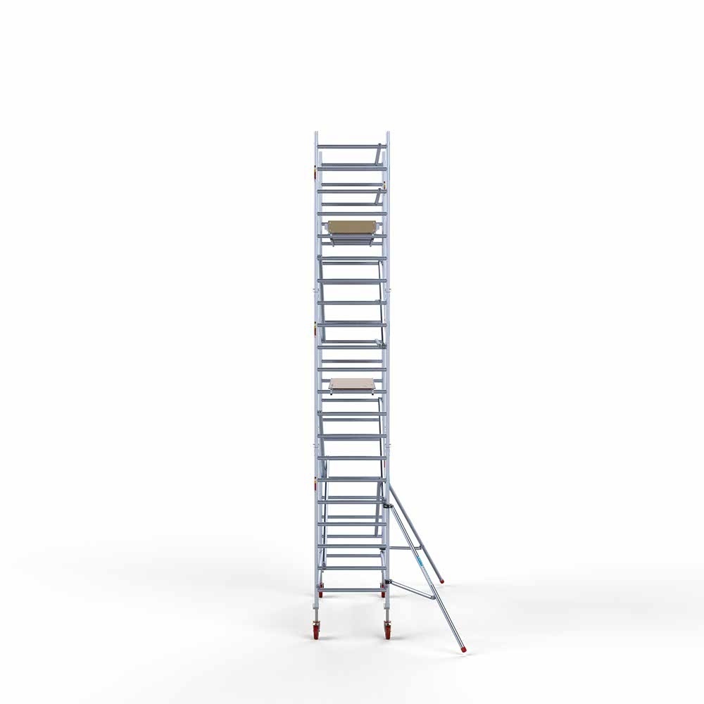 Deze rolsteiger heeft een steigerbreedte van 90, wat voor stevigheid en stabiliteit zorgt. De platformlengte is 250, wat genoeg werkruimte biedt. De werkhoogte van de rolsteiger is 7,2, waardoor je op de gewenste hoogte kunt werken.
