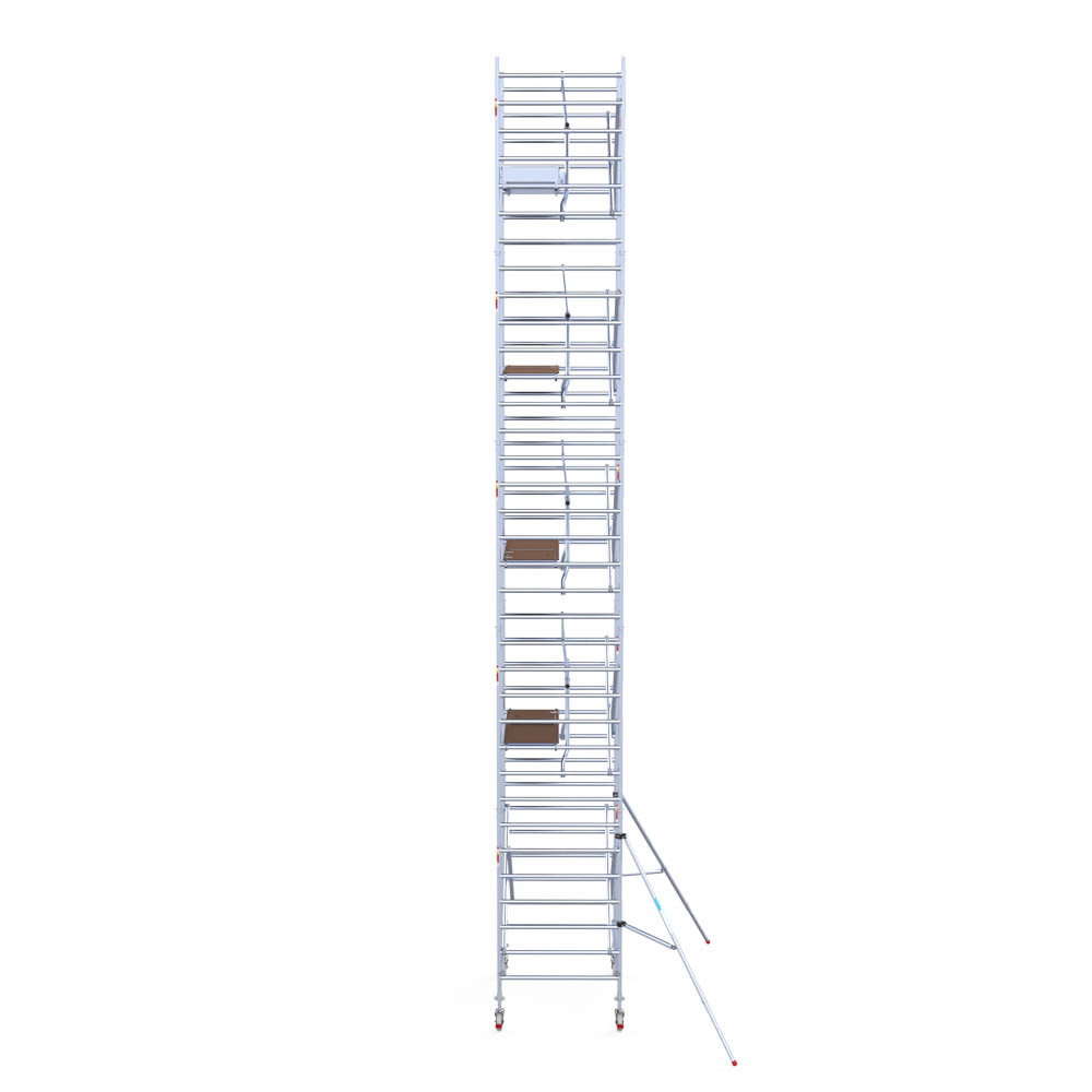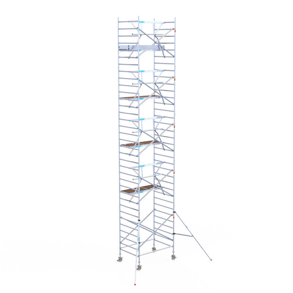 Deze rolsteiger heeft een steigerbreedte van 135, wat voor stabiliteit en stevigheid zorgt. De platformlengte is 190, wat voldoende werkruimte biedt. De werkhoogte van de rolsteiger is 11,2, waardoor je veilig op de gewenste hoogte kunt werken.