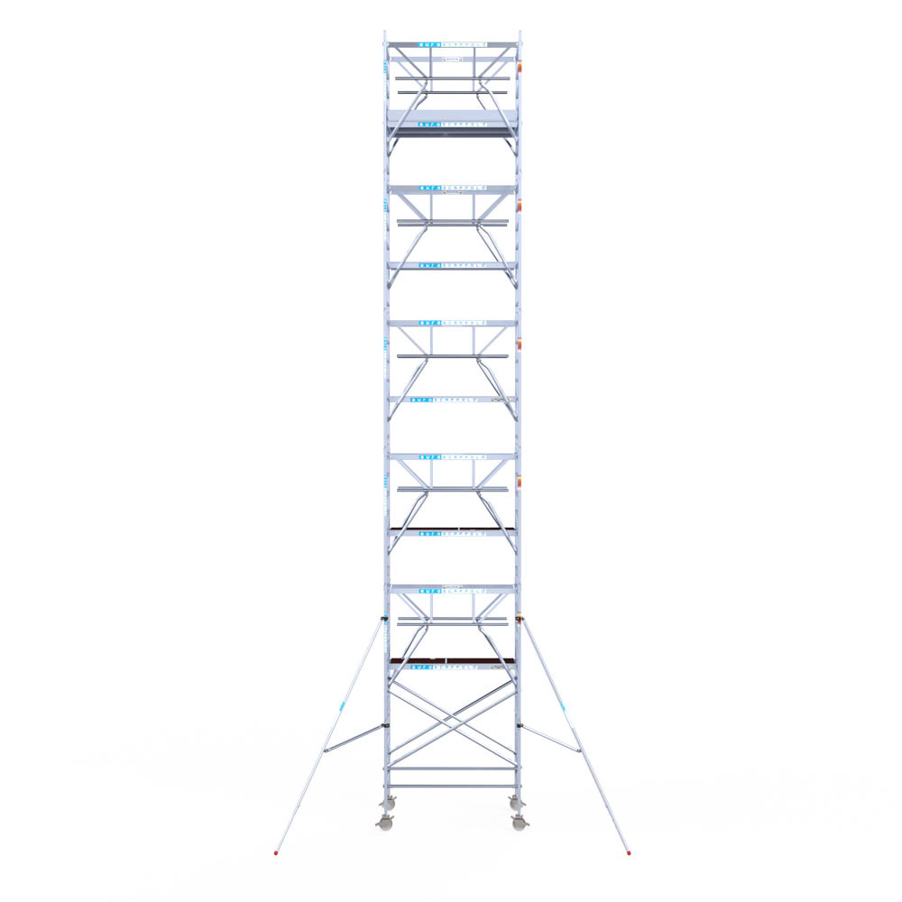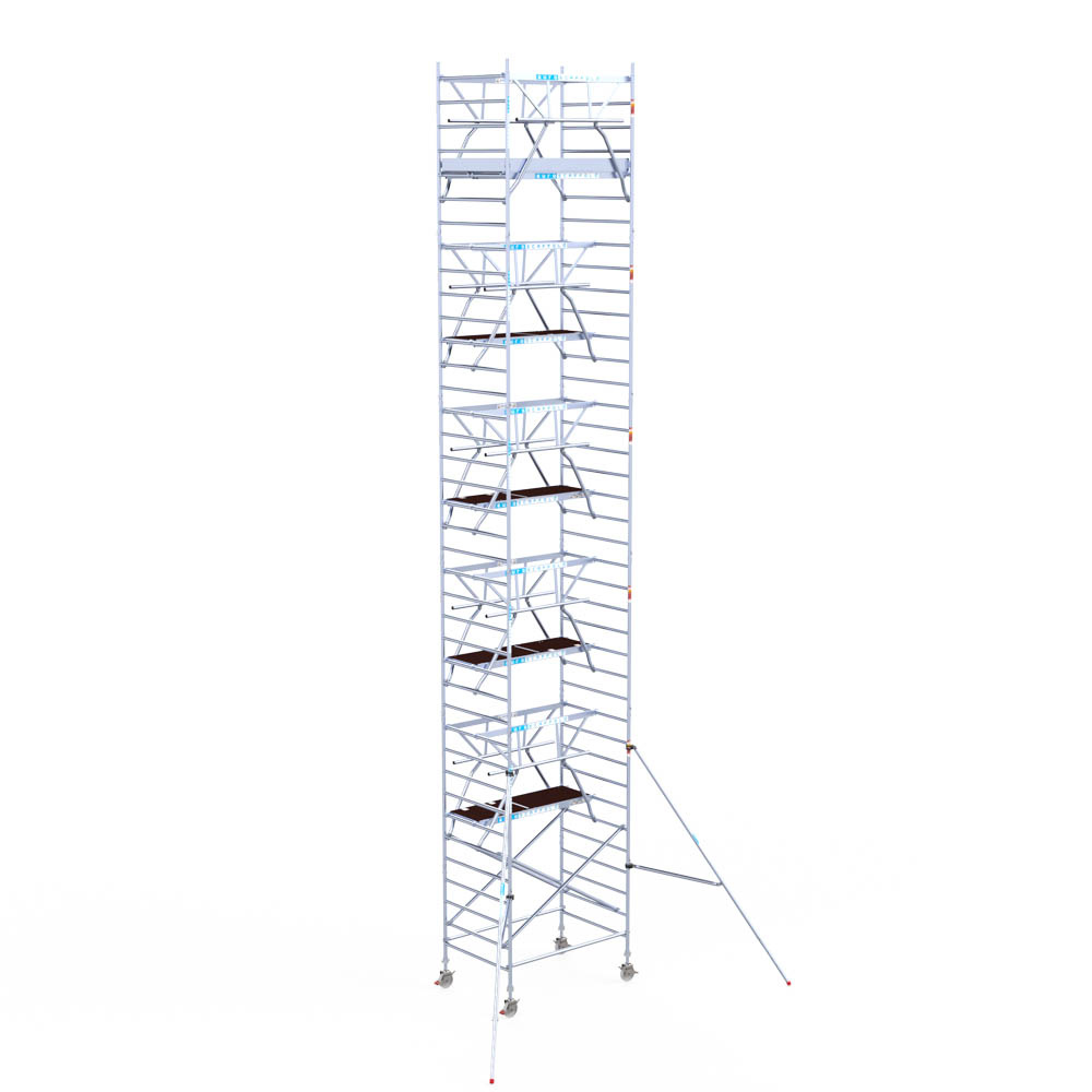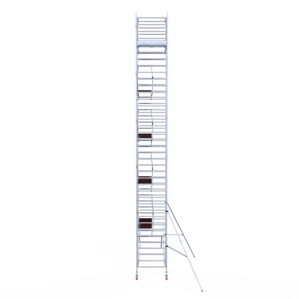 Deze rolsteiger heeft een steigerbreedte van 135, wat voor stabiliteit en stevigheid zorgt. De platformlengte is 190, wat voldoende werkruimte biedt. De werkhoogte van de rolsteiger is 12,2, waardoor je veilig op de gewenste hoogte kunt werken.