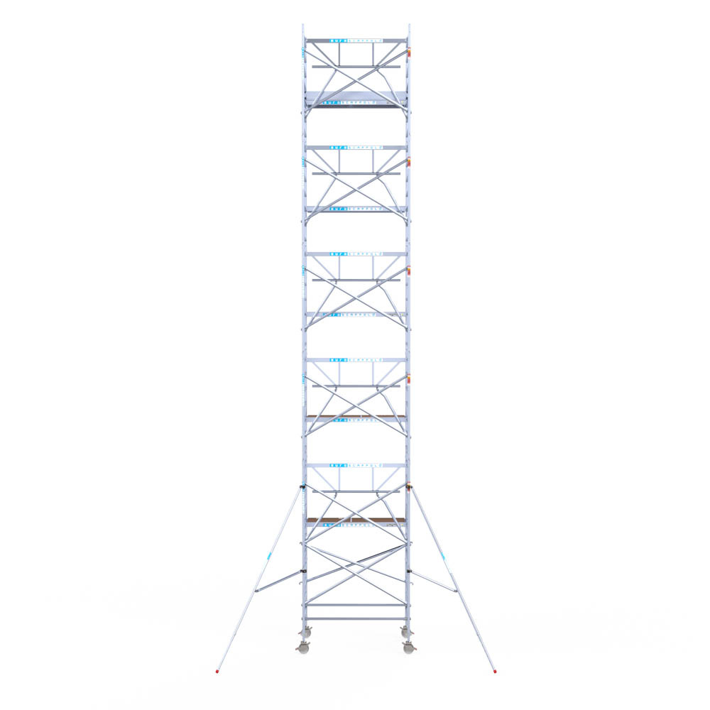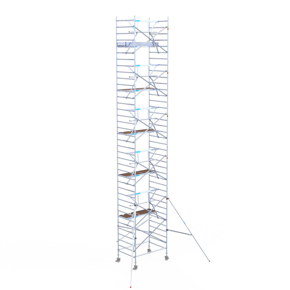Let wel; Door de vernieuwde EN 1004 norm en het A-blad rolsteigers voldoen de Euroscaffold Euro met enkel schoren zonder voorloopleuning niet meer aan de regelgeving voor zakelijk gebruik. De Euro uitvoering met voorloopleuningen voldoen hier wel aan. Voor particulier gebruik is de uitvoering met schoren wel voldoende.