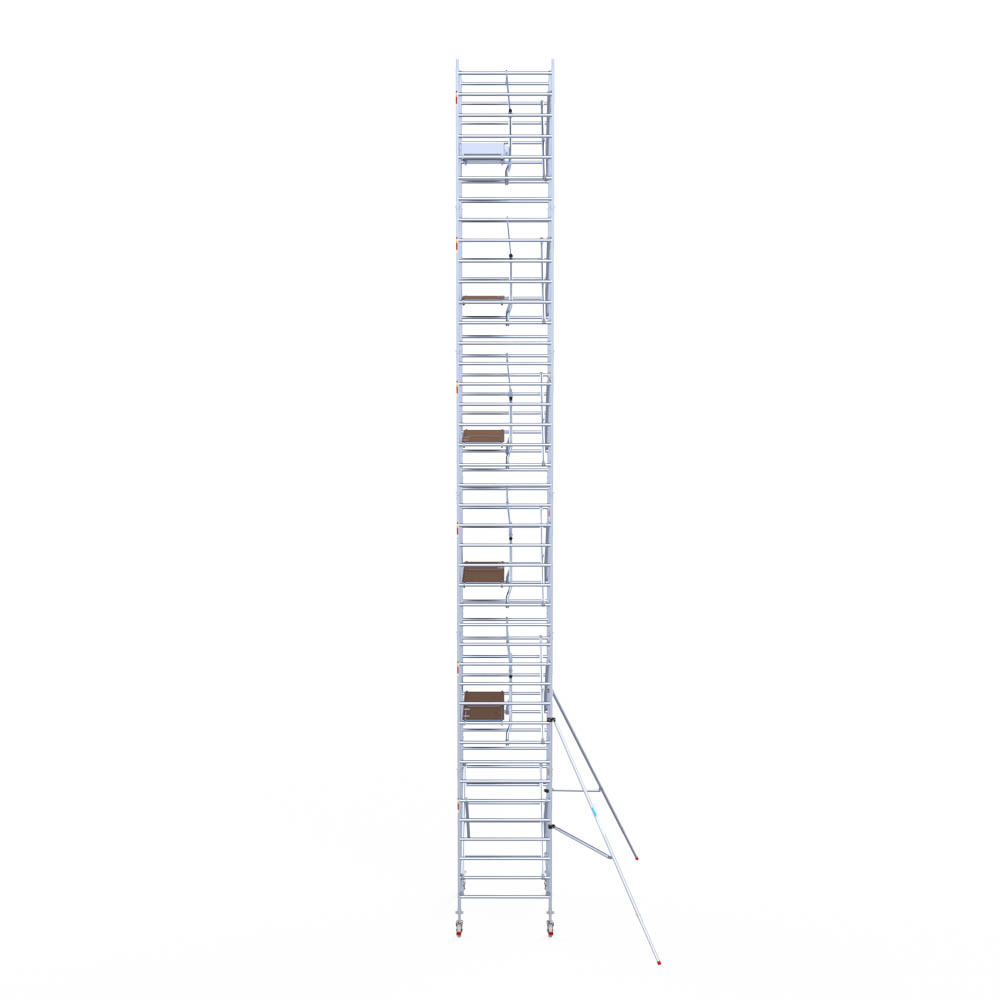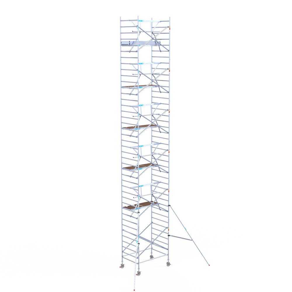 Deze rolsteiger heeft een steigerbreedte van 135, wat voor stabiliteit en stevigheid zorgt. De platformlengte is 190, wat voldoende werkruimte biedt. De werkhoogte van de rolsteiger is 13,2, waardoor je veilig op de gewenste hoogte kunt werken.