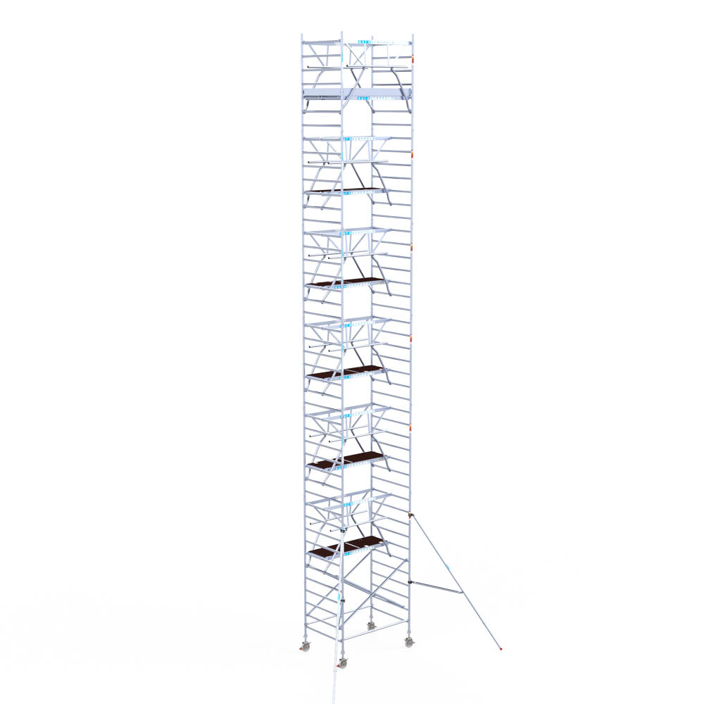 Let wel; Door de vernieuwde EN 1004 norm en het A-blad rolsteigers voldoen de Euroscaffold Euro met enkel schoren zonder voorloopleuning niet meer aan de regelgeving voor zakelijk gebruik. De Euro uitvoering met voorloopleuningen voldoen hier wel aan. Voor particulier gebruik is de uitvoering met schoren wel voldoende.