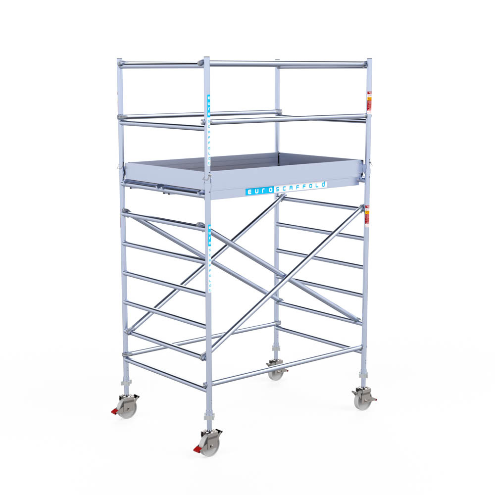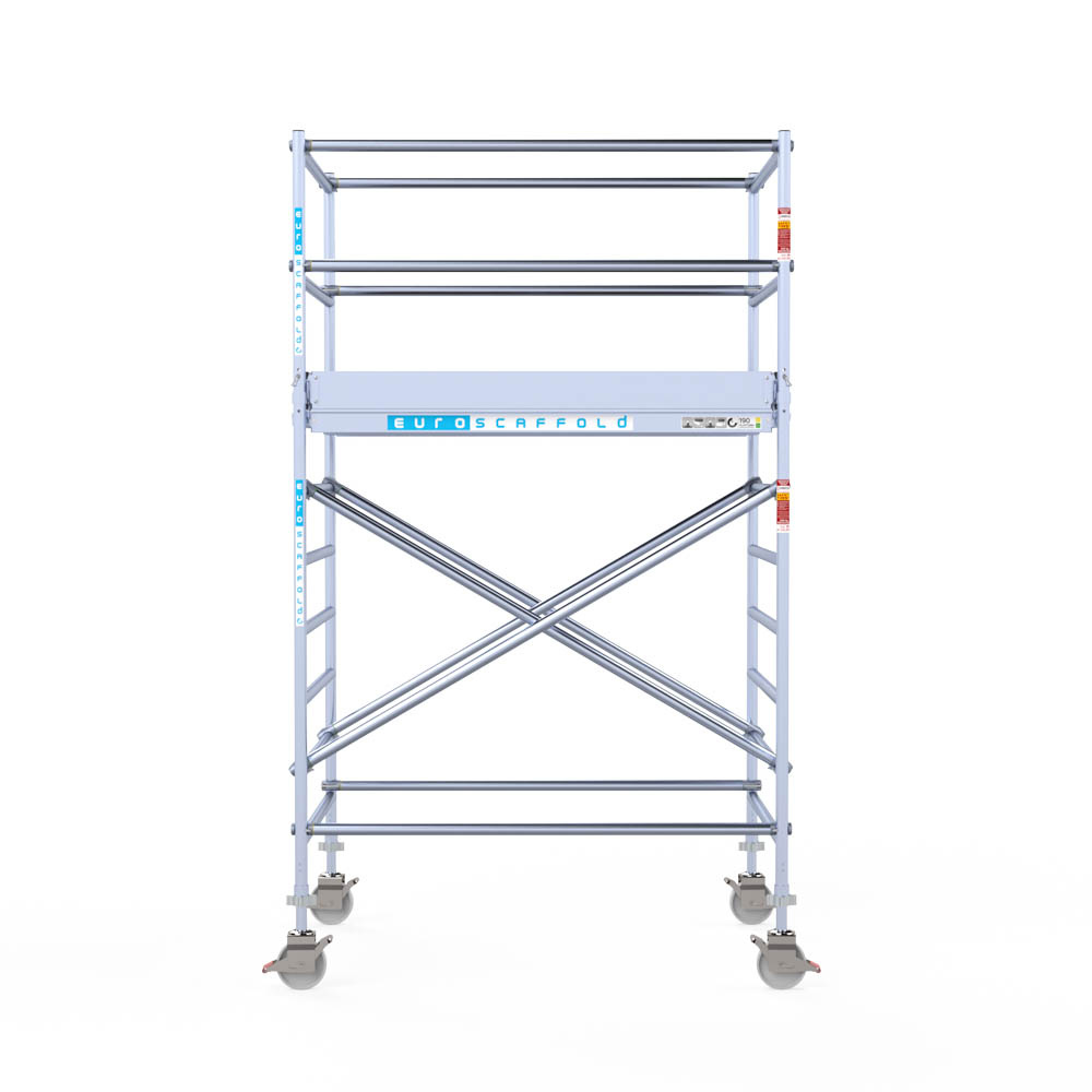 Let wel; Door de vernieuwde EN 1004 norm en het A-blad rolsteigers voldoen de Euroscaffold Euro met enkel schoren zonder voorloopleuning niet meer aan de regelgeving voor zakelijk gebruik. De Euro uitvoering met voorloopleuningen voldoen hier wel aan. Voor particulier gebruik is de uitvoering met schoren wel voldoende.