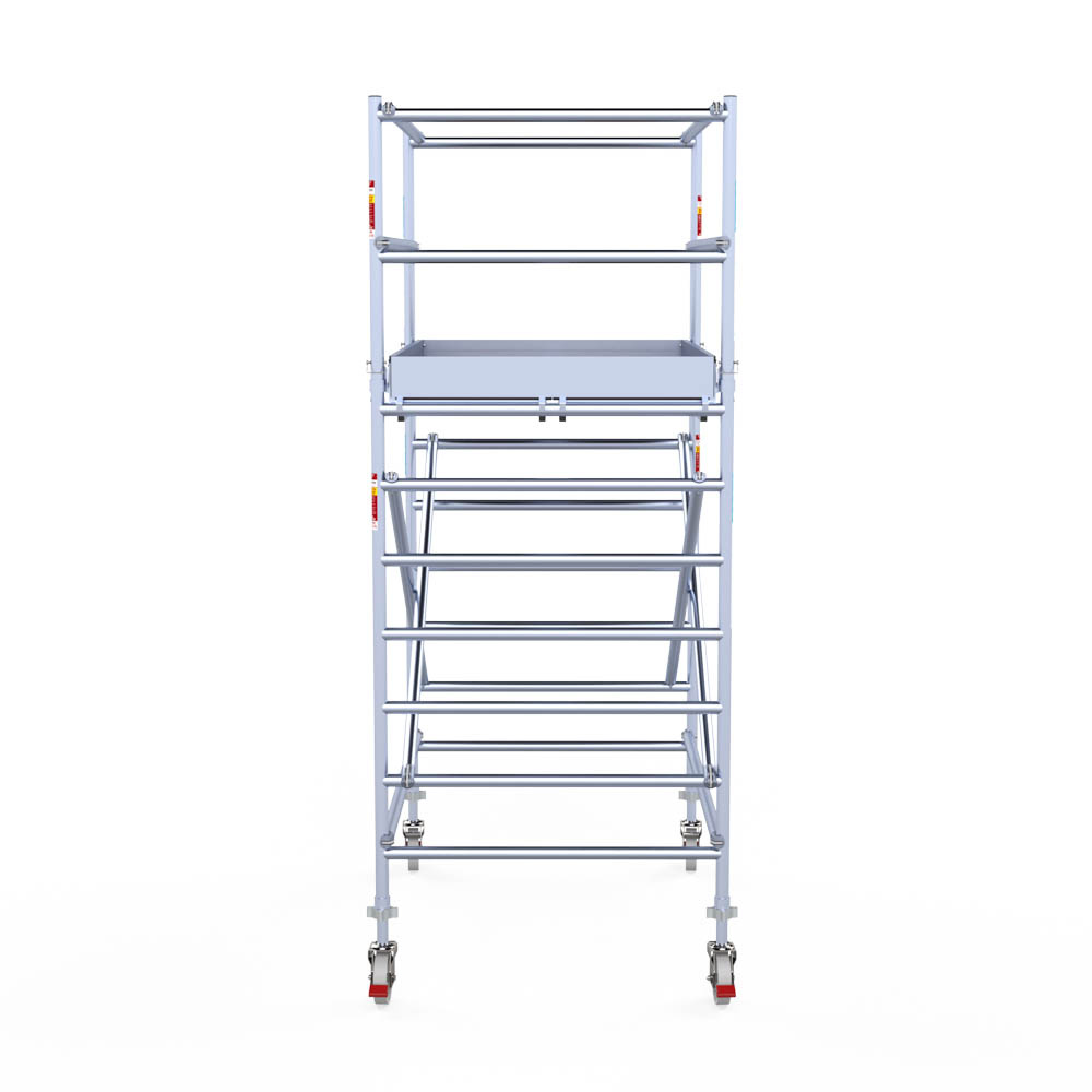 Deze rolsteiger heeft een steigerbreedte van 135, wat voor stabiliteit en stevigheid zorgt. De platformlengte is 190, wat voldoende werkruimte biedt. De werkhoogte van de rolsteiger is 4,2, waardoor je veilig op de gewenste hoogte kunt werken.