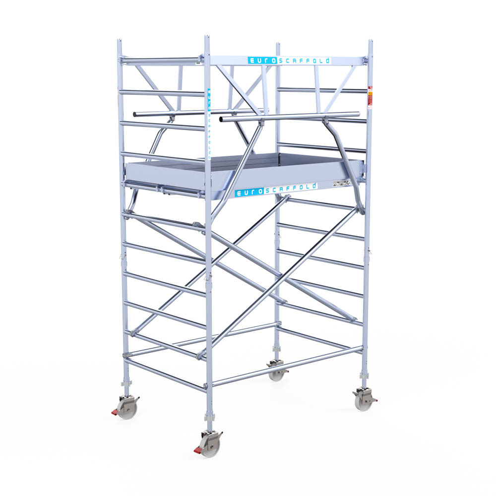 Let wel; Door de vernieuwde EN 1004 norm en het A-blad rolsteigers voldoen de Euroscaffold Euro met enkel schoren zonder voorloopleuning niet meer aan de regelgeving voor zakelijk gebruik. De Euro uitvoering met voorloopleuningen voldoen hier wel aan. Voor particulier gebruik is de uitvoering met schoren wel voldoende.