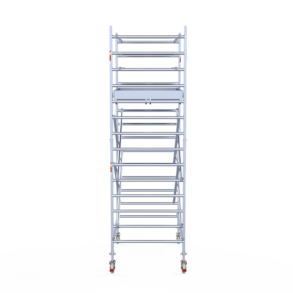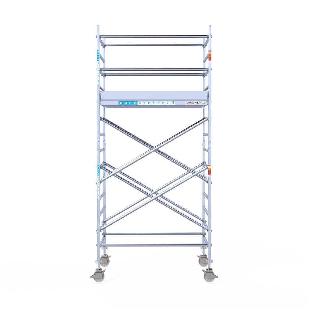 Let wel; Door de vernieuwde EN 1004 norm en het A-blad rolsteigers voldoen de Euroscaffold Euro met enkel schoren zonder voorloopleuning niet meer aan de regelgeving voor zakelijk gebruik. De Euro uitvoering met voorloopleuningen voldoen hier wel aan. Voor particulier gebruik is de uitvoering met schoren wel voldoende.
