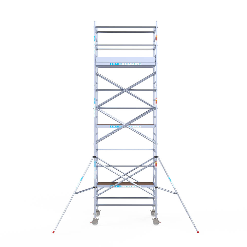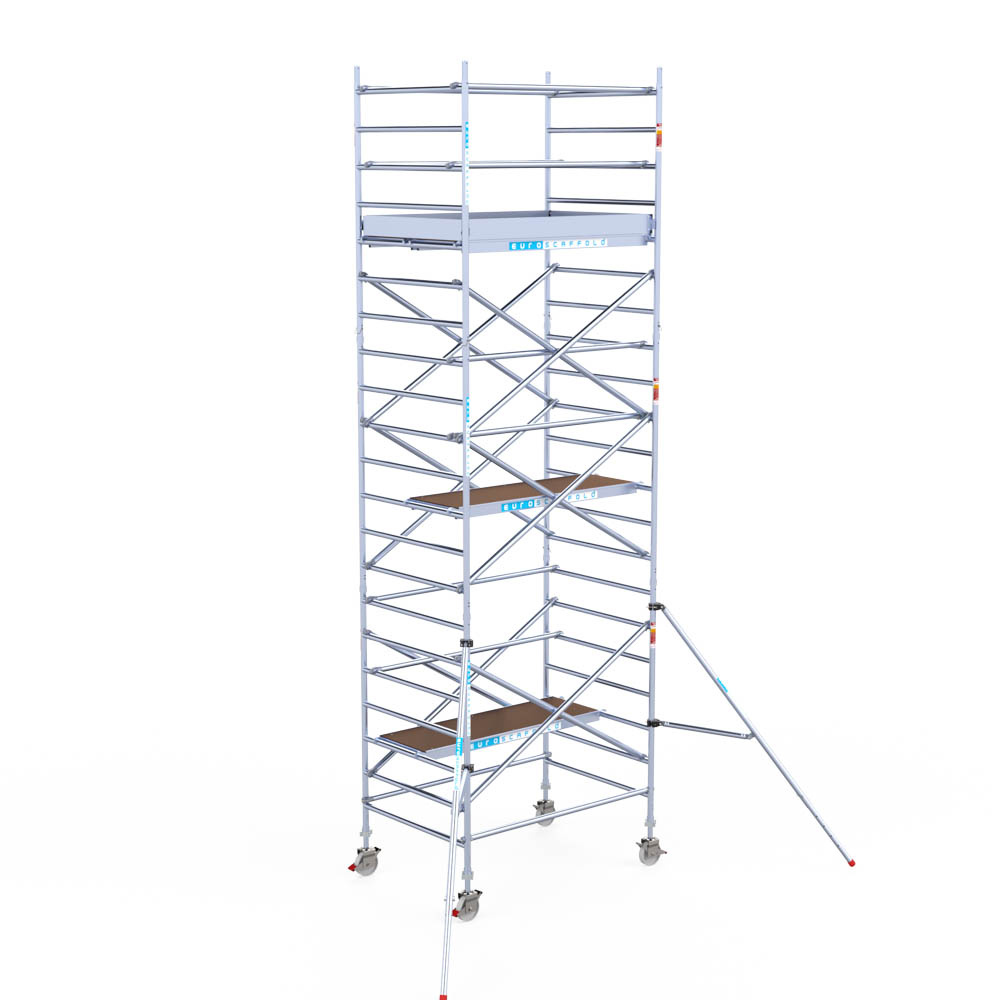 Let wel; Door de vernieuwde EN 1004 norm en het A-blad rolsteigers voldoen de Euroscaffold Euro met enkel schoren zonder voorloopleuning niet meer aan de regelgeving voor zakelijk gebruik. De Euro uitvoering met voorloopleuningen voldoen hier wel aan. Voor particulier gebruik is de uitvoering met schoren wel voldoende.