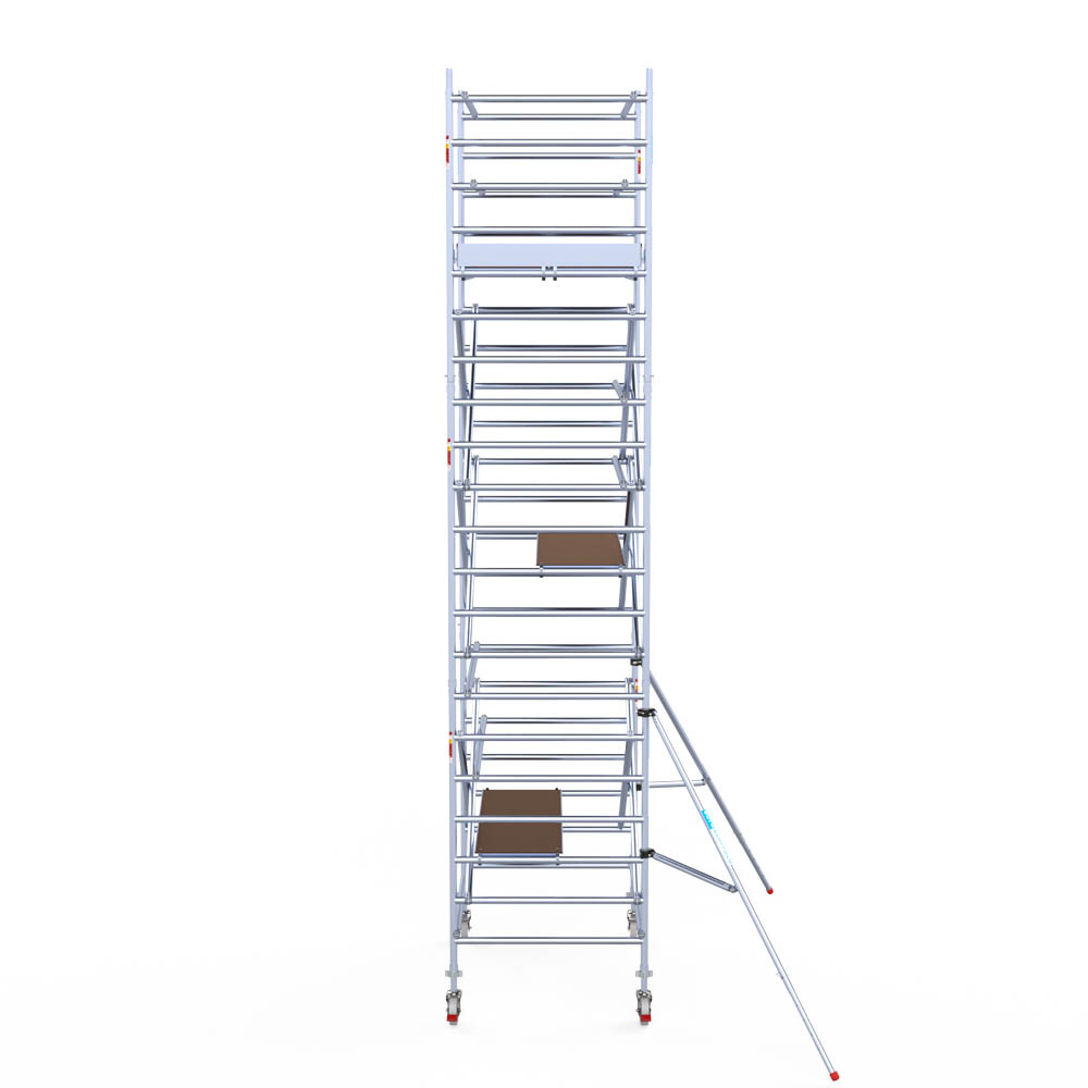Deze rolsteiger heeft een steigerbreedte van 135, wat voor stabiliteit en stevigheid zorgt. De platformlengte is 190, wat voldoende werkruimte biedt. De werkhoogte van de rolsteiger is 7,2, waardoor je veilig op de gewenste hoogte kunt werken.