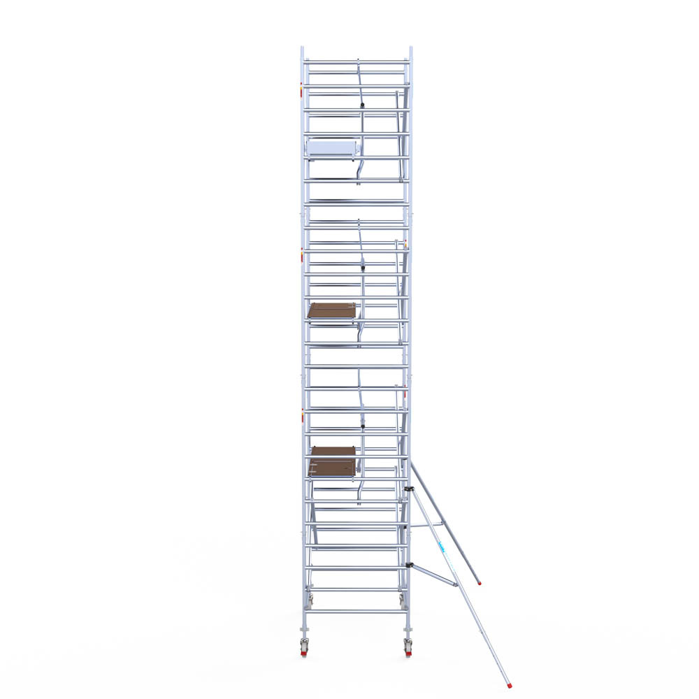Let wel; Door de vernieuwde EN 1004 norm en het A-blad rolsteigers voldoen de Euroscaffold Euro met enkel schoren zonder voorloopleuning niet meer aan de regelgeving voor zakelijk gebruik. De Euro uitvoering met voorloopleuningen voldoen hier wel aan. Voor particulier gebruik is de uitvoering met schoren wel voldoende.