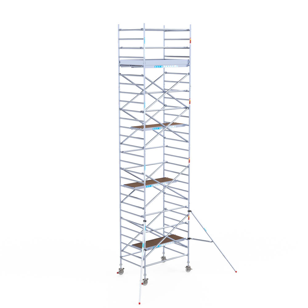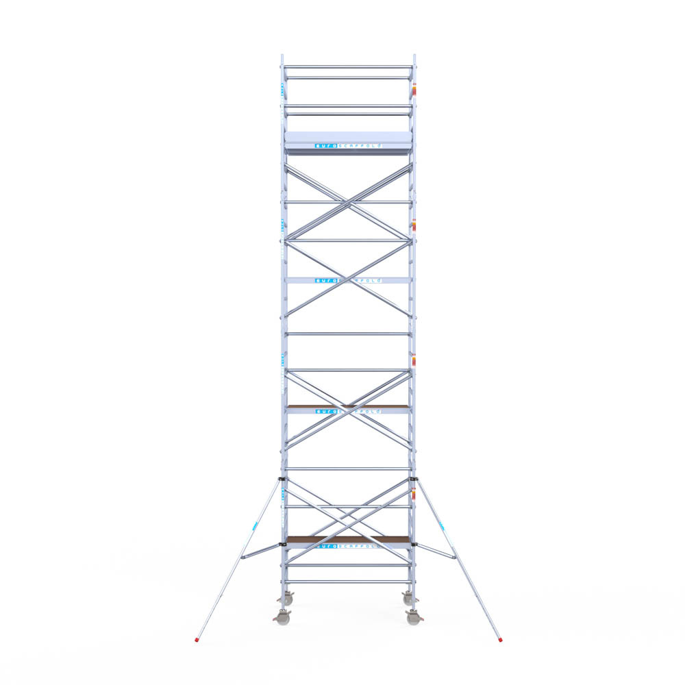 Let wel; Door de vernieuwde EN 1004 norm en het A-blad rolsteigers voldoen de Euroscaffold Euro met enkel schoren zonder voorloopleuning niet meer aan de regelgeving voor zakelijk gebruik. De Euro uitvoering met voorloopleuningen voldoen hier wel aan. Voor particulier gebruik is de uitvoering met schoren wel voldoende.