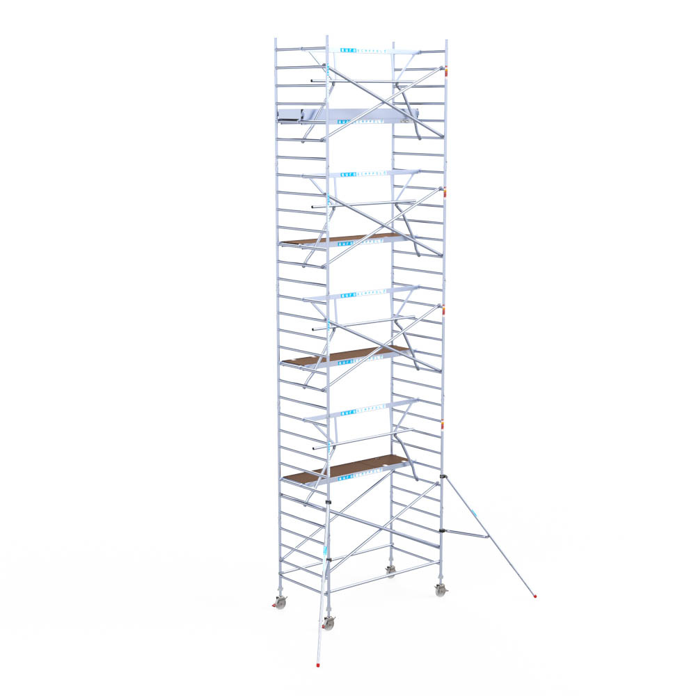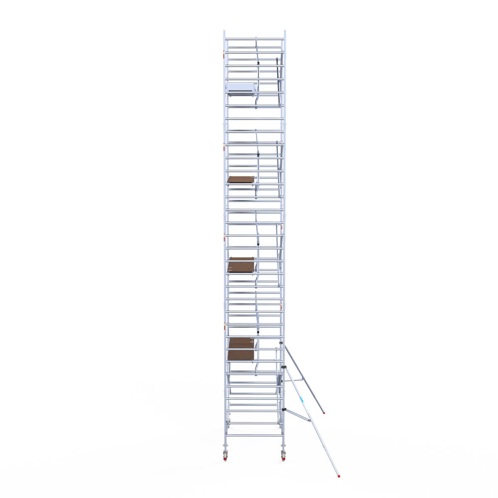 Deze rolsteiger heeft een steigerbreedte van 135, wat voor stabiliteit en stevigheid zorgt. De platformlengte is 250, wat voldoende werkruimte biedt. De werkhoogte van de rolsteiger is 10,2, waardoor je veilig op de gewenste hoogte kunt werken.