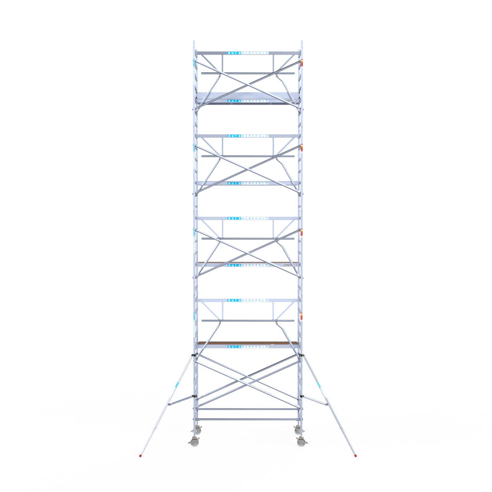 Let wel; Door de vernieuwde EN 1004 norm en het A-blad rolsteigers voldoen de Euroscaffold Euro met enkel schoren zonder voorloopleuning niet meer aan de regelgeving voor zakelijk gebruik. De Euro uitvoering met voorloopleuningen voldoen hier wel aan. Voor particulier gebruik is de uitvoering met schoren wel voldoende.