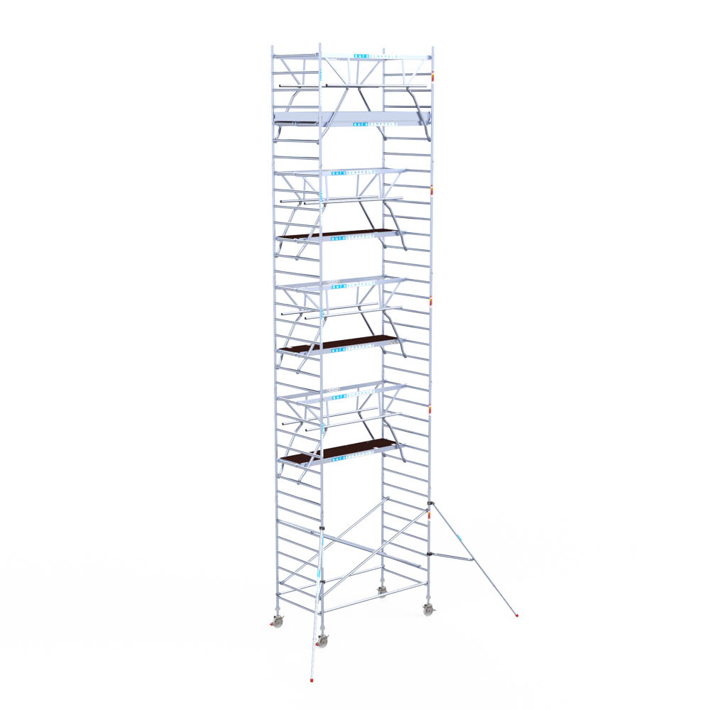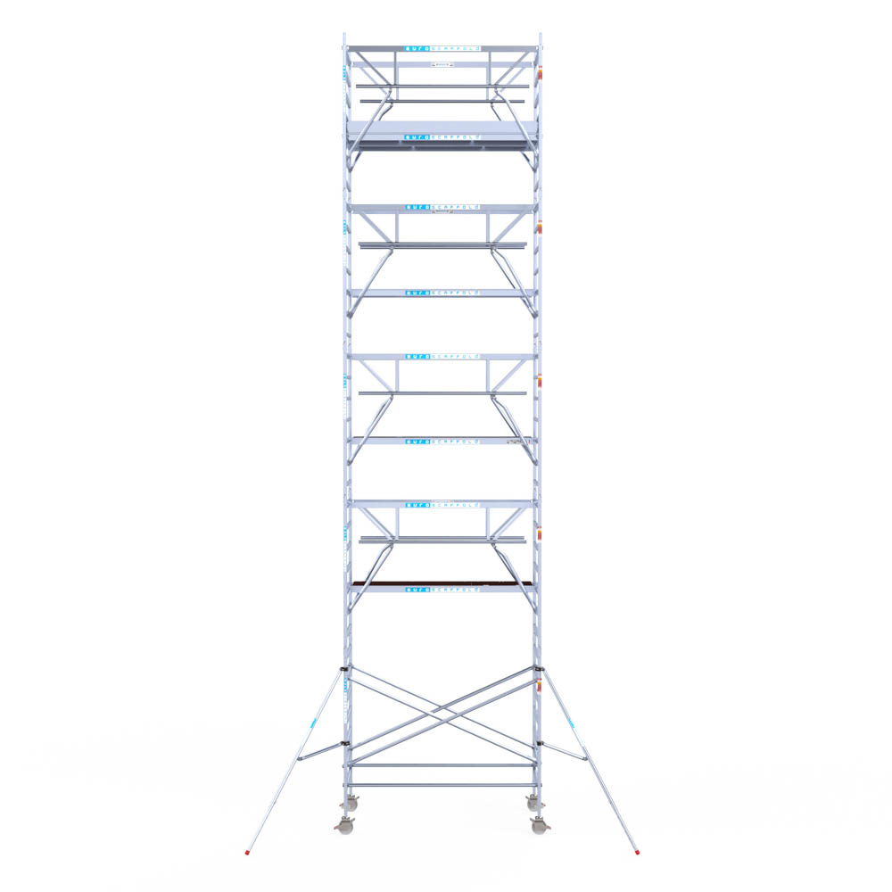 Let wel; Door de vernieuwde EN 1004 norm en het A-blad rolsteigers voldoen de Euroscaffold Euro met enkel schoren zonder voorloopleuning niet meer aan de regelgeving voor zakelijk gebruik. De Euro uitvoering met voorloopleuningen voldoen hier wel aan. Voor particulier gebruik is de uitvoering met schoren wel voldoende.