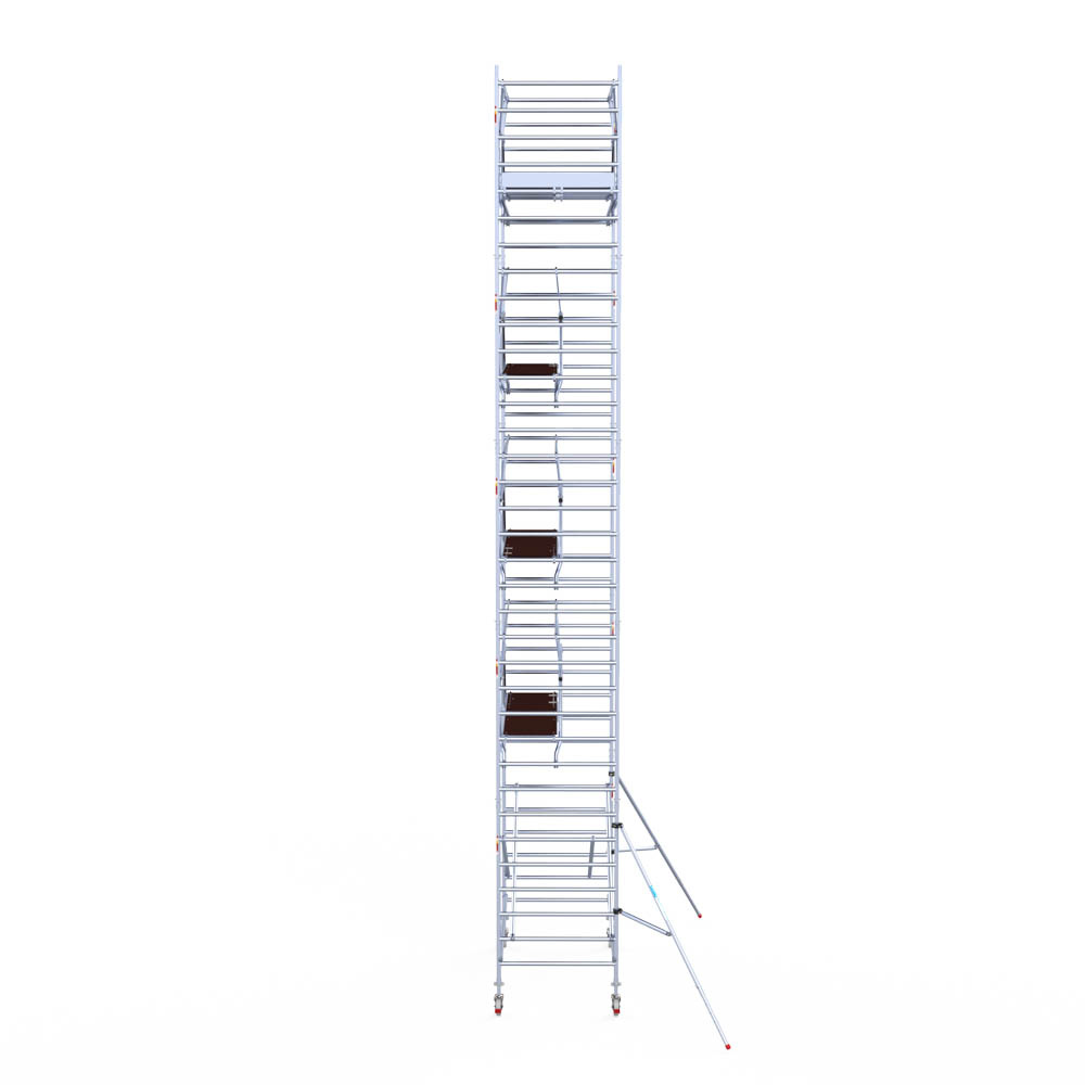 Deze rolsteiger heeft een steigerbreedte van 135, wat voor stabiliteit en stevigheid zorgt. De platformlengte is 250, wat voldoende werkruimte biedt. De werkhoogte van de rolsteiger is 11,2, waardoor je veilig op de gewenste hoogte kunt werken.