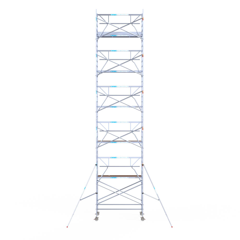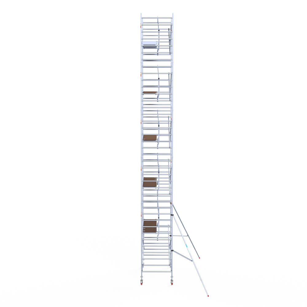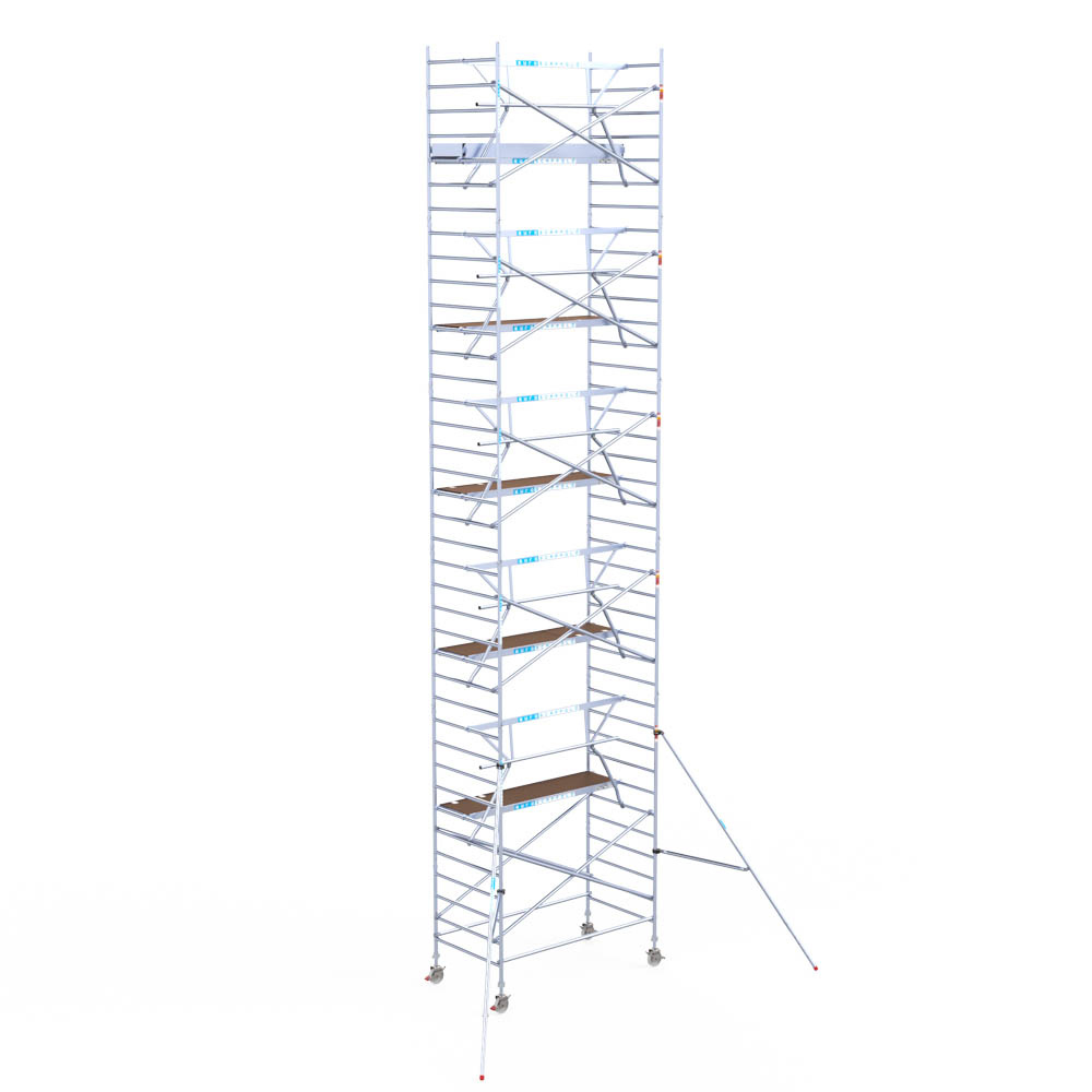 Deze rolsteiger heeft een steigerbreedte van 135, wat voor stabiliteit en stevigheid zorgt. De platformlengte is 250, wat voldoende werkruimte biedt. De werkhoogte van de rolsteiger is 12,2, waardoor je veilig op de gewenste hoogte kunt werken.