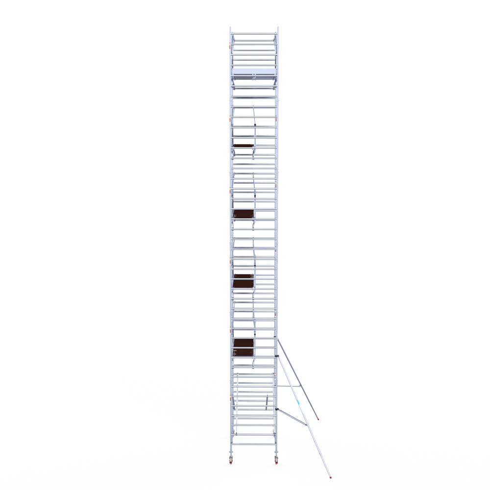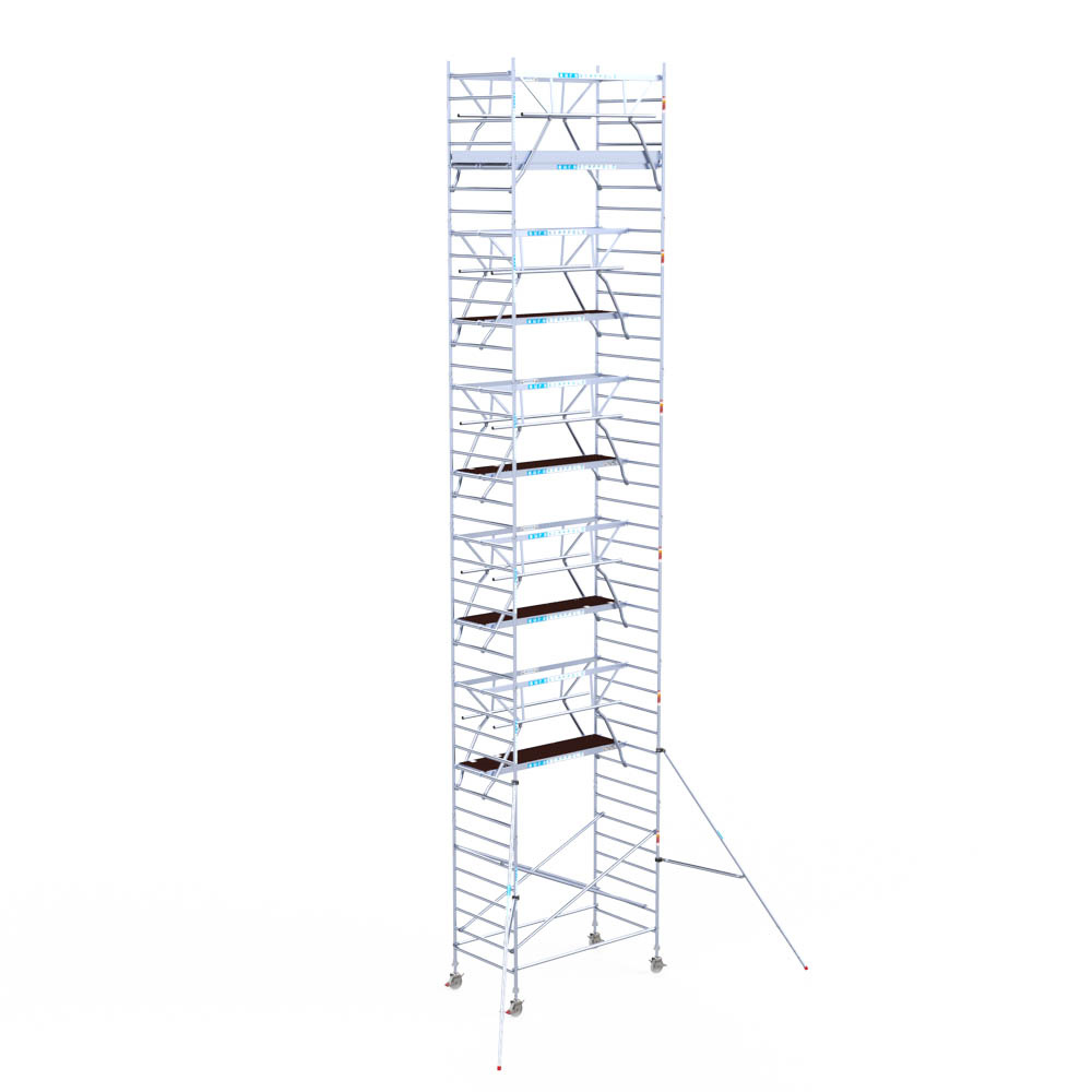 Deze rolsteiger heeft een steigerbreedte van 135, wat voor stabiliteit en stevigheid zorgt. De platformlengte is 250, wat voldoende werkruimte biedt. De werkhoogte van de rolsteiger is 13,2, waardoor je veilig op de gewenste hoogte kunt werken.