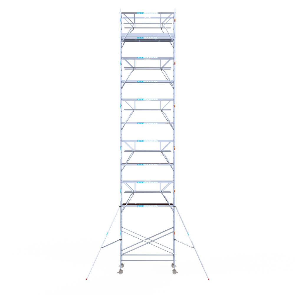 Let wel; Door de vernieuwde EN 1004 norm en het A-blad rolsteigers voldoen de Euroscaffold Euro met enkel schoren zonder voorloopleuning niet meer aan de regelgeving voor zakelijk gebruik. De Euro uitvoering met voorloopleuningen voldoen hier wel aan. Voor particulier gebruik is de uitvoering met schoren wel voldoende.