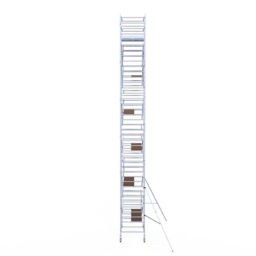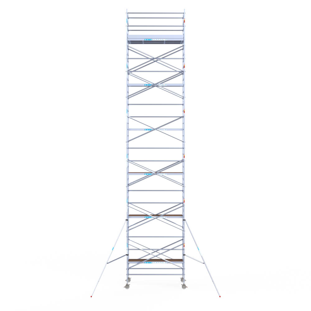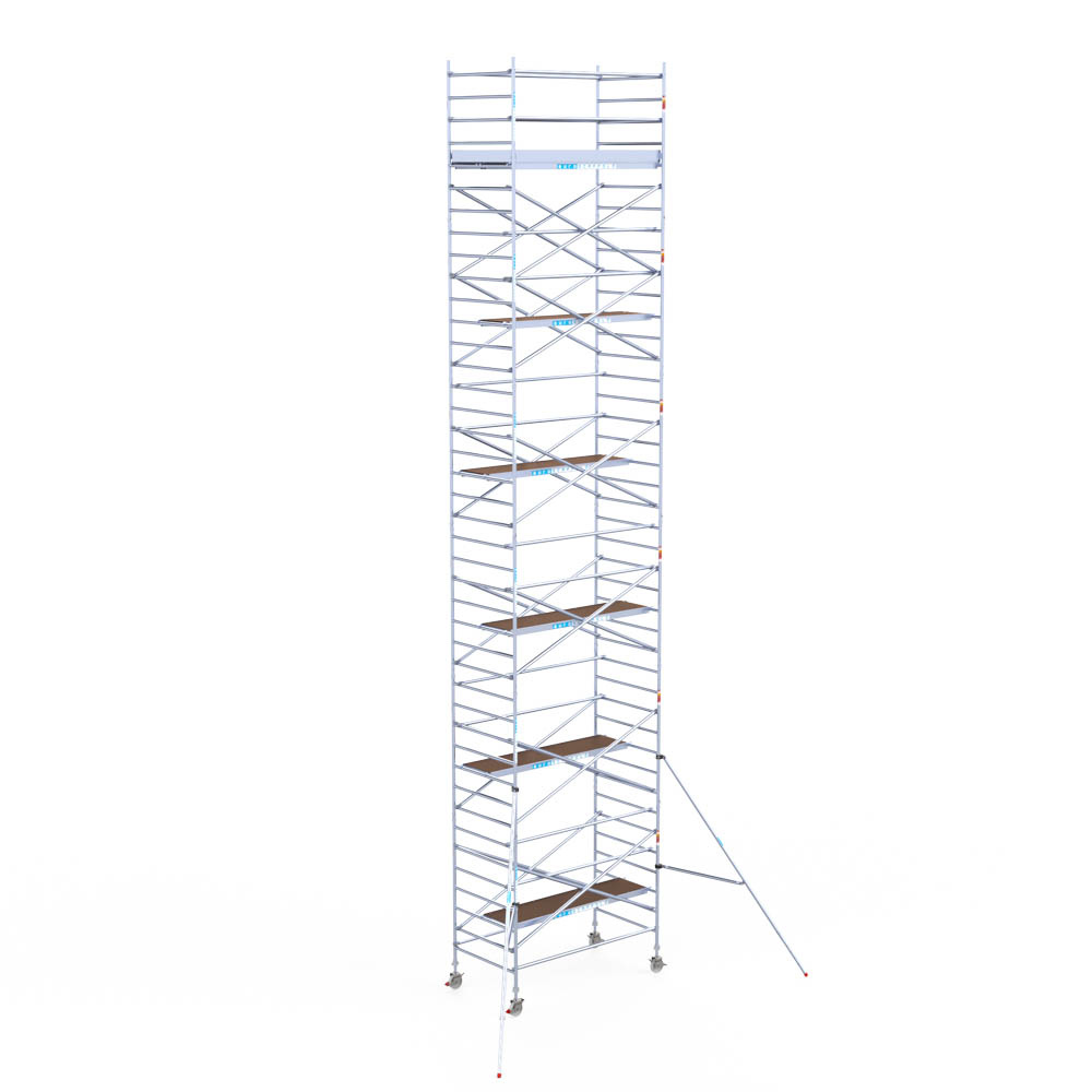 Deze rolsteiger heeft een steigerbreedte van 135, wat voor stabiliteit en stevigheid zorgt. De platformlengte is 250, wat voldoende werkruimte biedt. De werkhoogte van de rolsteiger is 13,2, waardoor je veilig op de gewenste hoogte kunt werken.