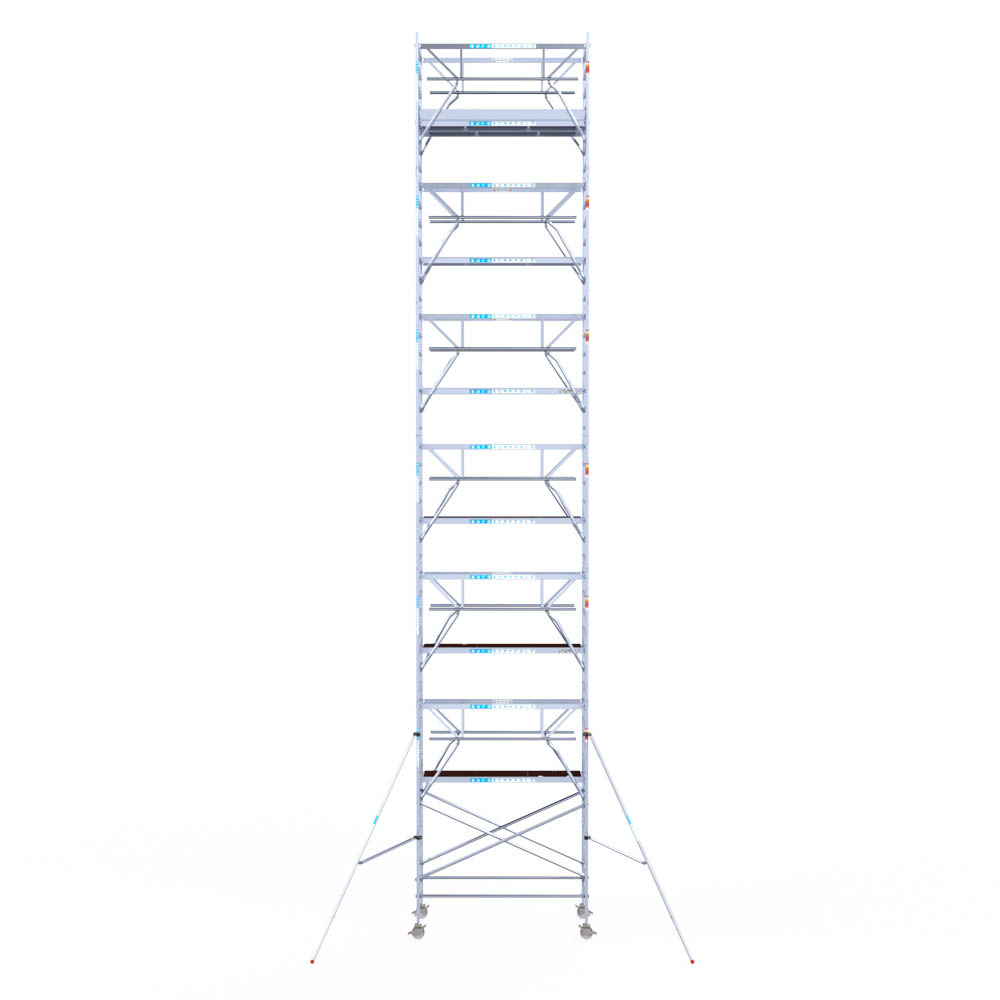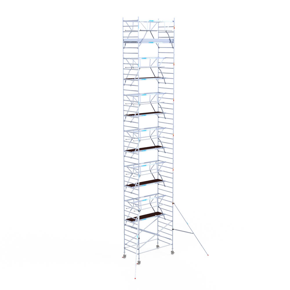 Let wel; Door de vernieuwde EN 1004 norm en het A-blad rolsteigers voldoen de Euroscaffold Euro met enkel schoren zonder voorloopleuning niet meer aan de regelgeving voor zakelijk gebruik. De Euro uitvoering met voorloopleuningen voldoen hier wel aan. Voor particulier gebruik is de uitvoering met schoren wel voldoende.