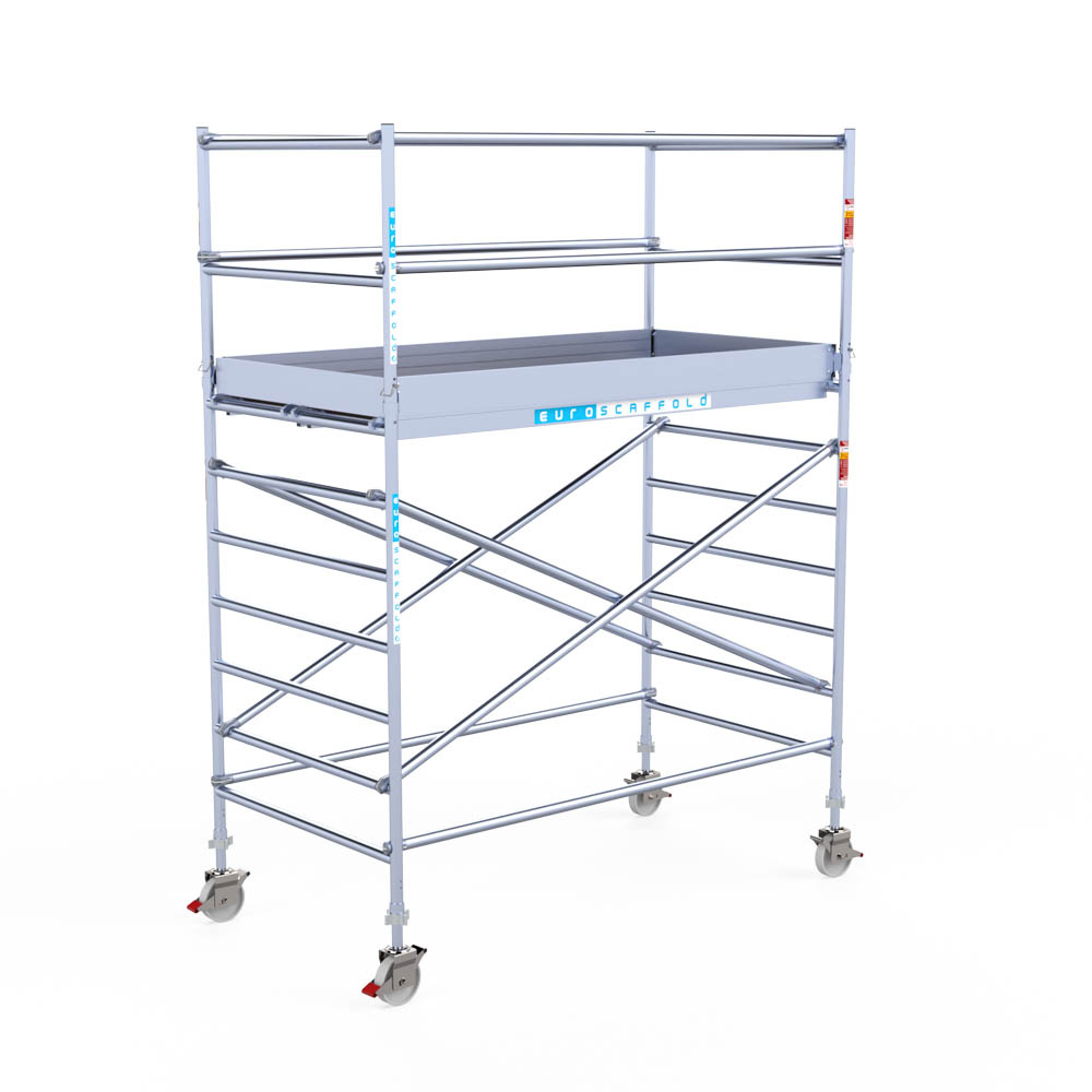 Let wel; Door de vernieuwde EN 1004 norm en het A-blad rolsteigers voldoen de Euroscaffold Euro met enkel schoren zonder voorloopleuning niet meer aan de regelgeving voor zakelijk gebruik. De Euro uitvoering met voorloopleuningen voldoen hier wel aan. Voor particulier gebruik is de uitvoering met schoren wel voldoende.