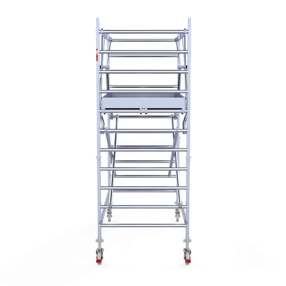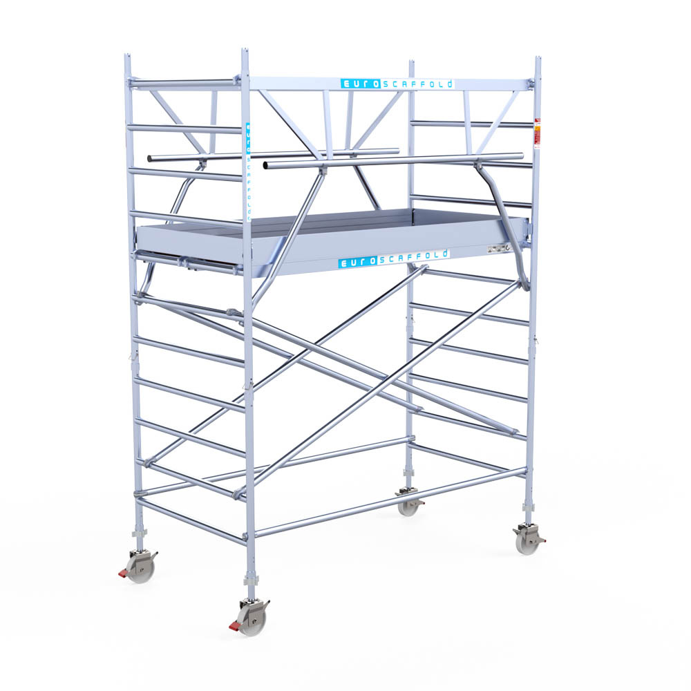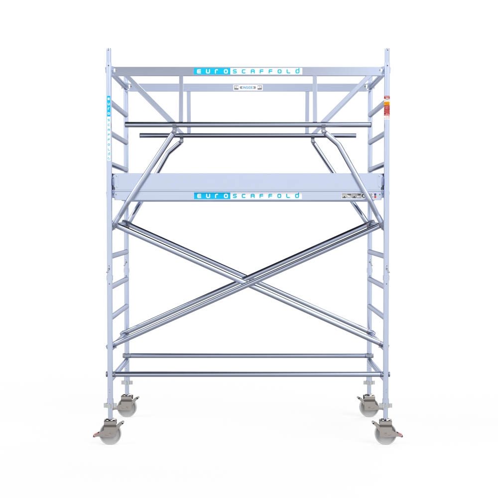 Let wel; Door de vernieuwde EN 1004 norm en het A-blad rolsteigers voldoen de Euroscaffold Euro met enkel schoren zonder voorloopleuning niet meer aan de regelgeving voor zakelijk gebruik. De Euro uitvoering met voorloopleuningen voldoen hier wel aan. Voor particulier gebruik is de uitvoering met schoren wel voldoende.