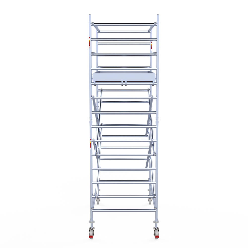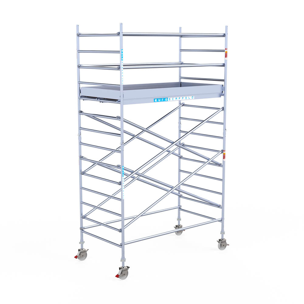 Let wel; Door de vernieuwde EN 1004 norm en het A-blad rolsteigers voldoen de Euroscaffold Euro met enkel schoren zonder voorloopleuning niet meer aan de regelgeving voor zakelijk gebruik. De Euro uitvoering met voorloopleuningen voldoen hier wel aan. Voor particulier gebruik is de uitvoering met schoren wel voldoende.