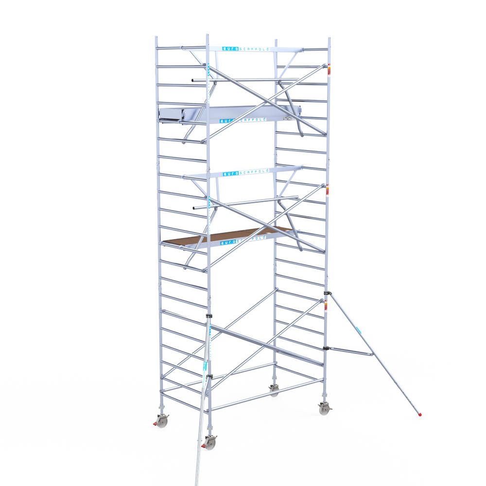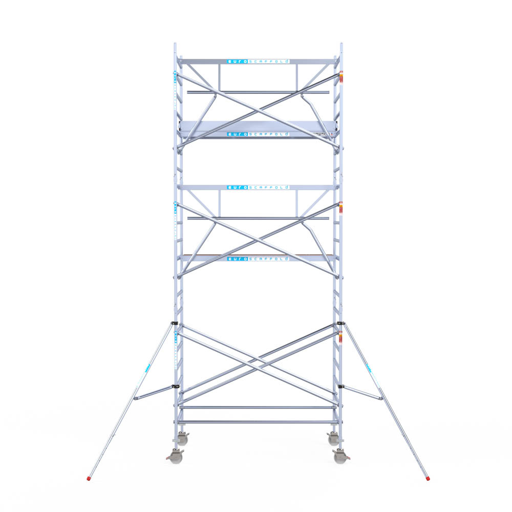 Let wel; Door de vernieuwde EN 1004 norm en het A-blad rolsteigers voldoen de Euroscaffold Euro met enkel schoren zonder voorloopleuning niet meer aan de regelgeving voor zakelijk gebruik. De Euro uitvoering met voorloopleuningen voldoen hier wel aan. Voor particulier gebruik is de uitvoering met schoren wel voldoende.