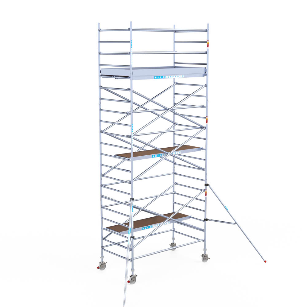 Let wel; Door de vernieuwde EN 1004 norm en het A-blad rolsteigers voldoen de Euroscaffold Euro met enkel schoren zonder voorloopleuning niet meer aan de regelgeving voor zakelijk gebruik. De Euro uitvoering met voorloopleuningen voldoen hier wel aan. Voor particulier gebruik is de uitvoering met schoren wel voldoende.