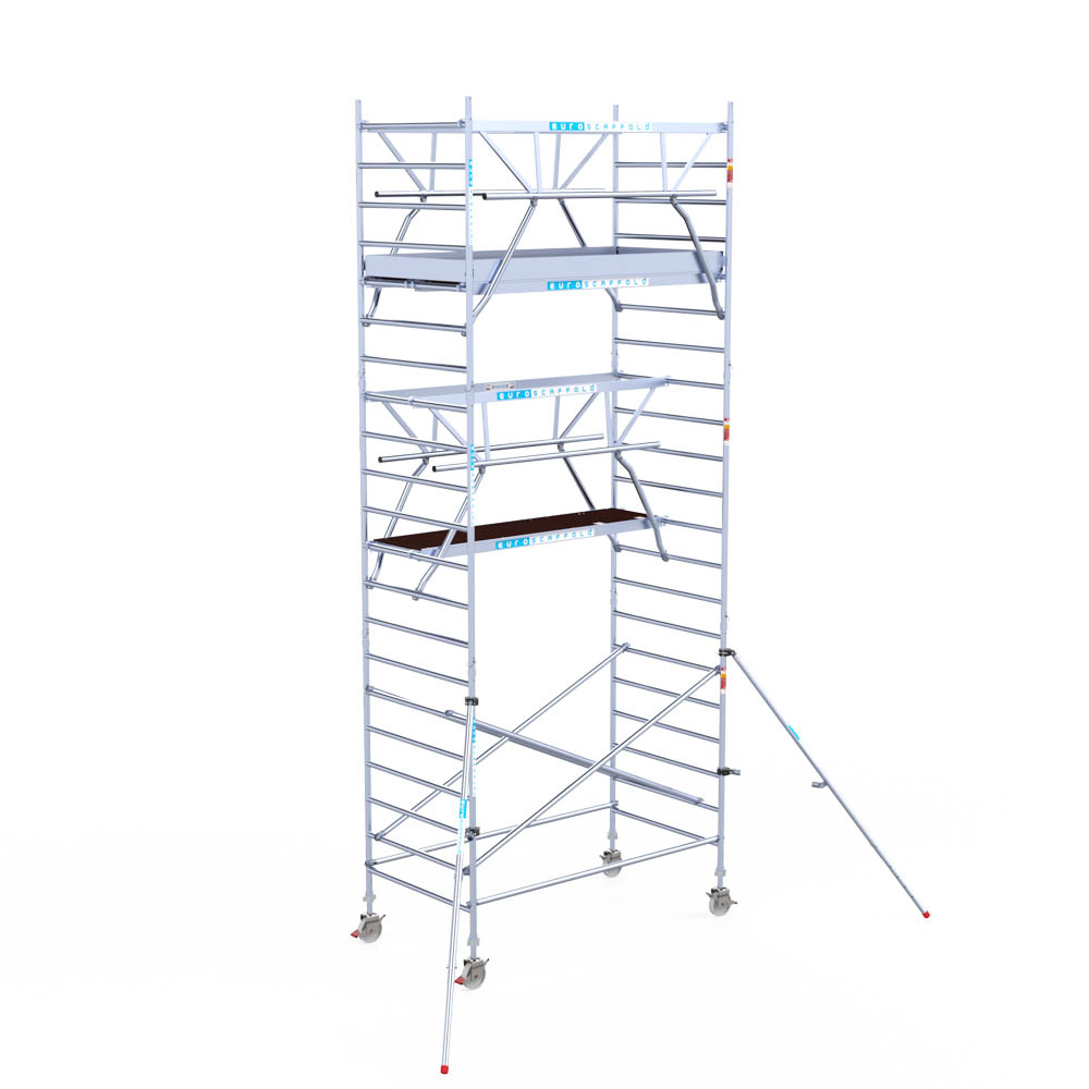 Let wel; Door de vernieuwde EN 1004 norm en het A-blad rolsteigers voldoen de Euroscaffold Euro met enkel schoren zonder voorloopleuning niet meer aan de regelgeving voor zakelijk gebruik. De Euro uitvoering met voorloopleuningen voldoen hier wel aan. Voor particulier gebruik is de uitvoering met schoren wel voldoende.