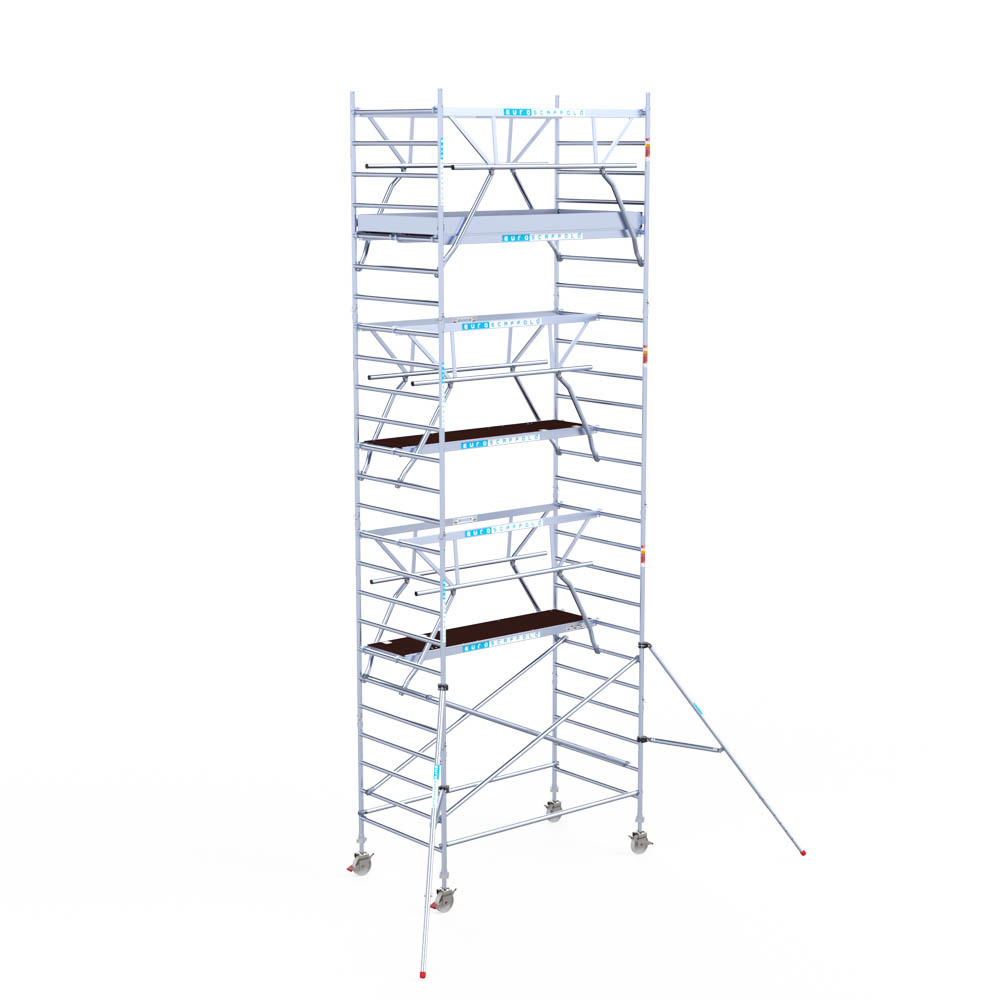 Let wel; Door de vernieuwde EN 1004 norm en het A-blad rolsteigers voldoen de Euroscaffold Euro met enkel schoren zonder voorloopleuning niet meer aan de regelgeving voor zakelijk gebruik. De Euro uitvoering met voorloopleuningen voldoen hier wel aan. Voor particulier gebruik is de uitvoering met schoren wel voldoende.