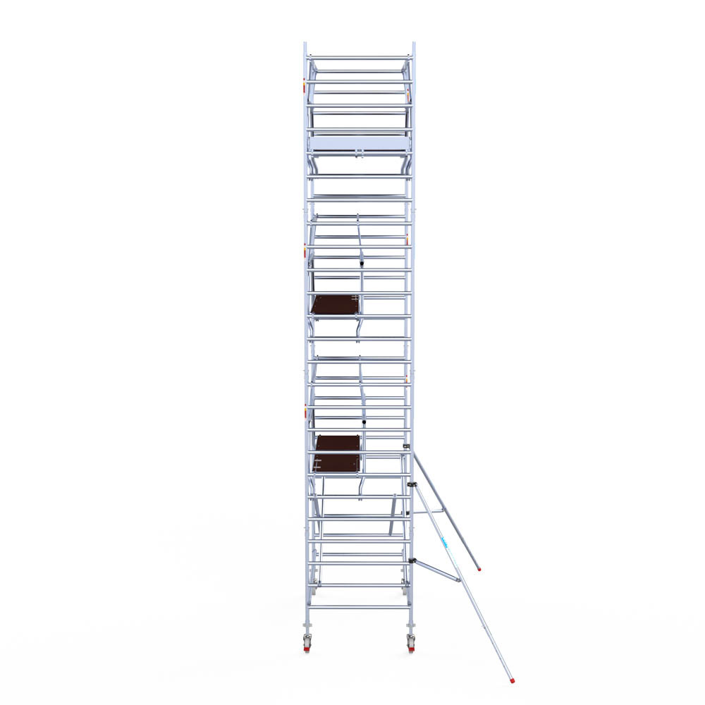 Deze rolsteiger heeft een steigerbreedte van 135, wat voor stabiliteit en stevigheid zorgt. De platformlengte is 250, wat voldoende werkruimte biedt. De werkhoogte van de rolsteiger is 8,2, waardoor je veilig op de gewenste hoogte kunt werken.