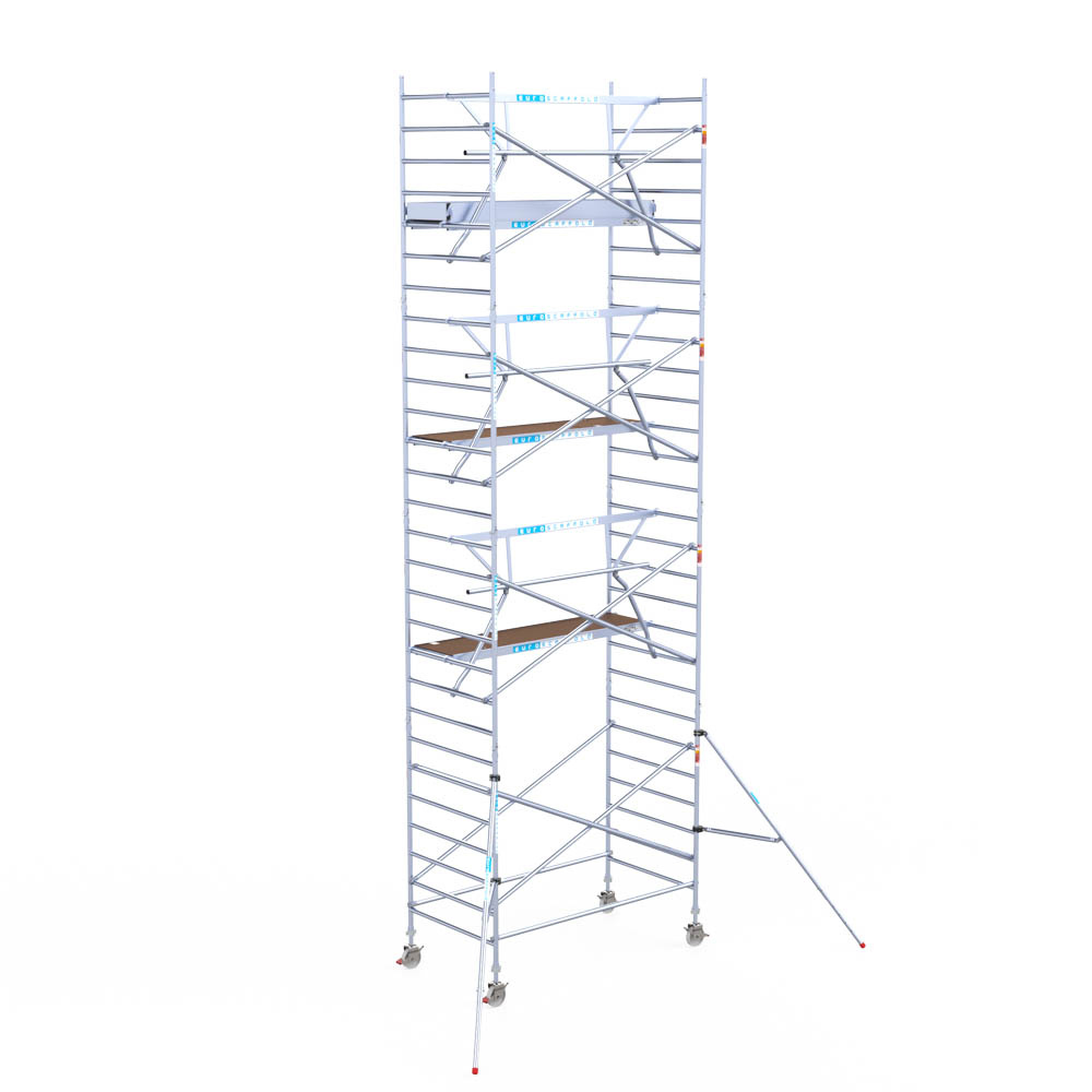 Let wel; Door de vernieuwde EN 1004 norm en het A-blad rolsteigers voldoen de Euroscaffold Euro met enkel schoren zonder voorloopleuning niet meer aan de regelgeving voor zakelijk gebruik. De Euro uitvoering met voorloopleuningen voldoen hier wel aan. Voor particulier gebruik is de uitvoering met schoren wel voldoende.