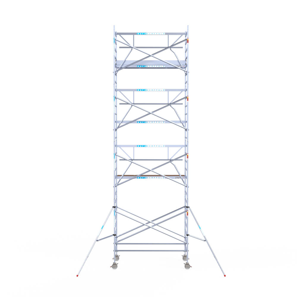 Deze rolsteiger heeft een steigerbreedte van 135, wat voor stabiliteit en stevigheid zorgt. De platformlengte is 250, wat voldoende werkruimte biedt. De werkhoogte van de rolsteiger is 9,2, waardoor je veilig op de gewenste hoogte kunt werken.