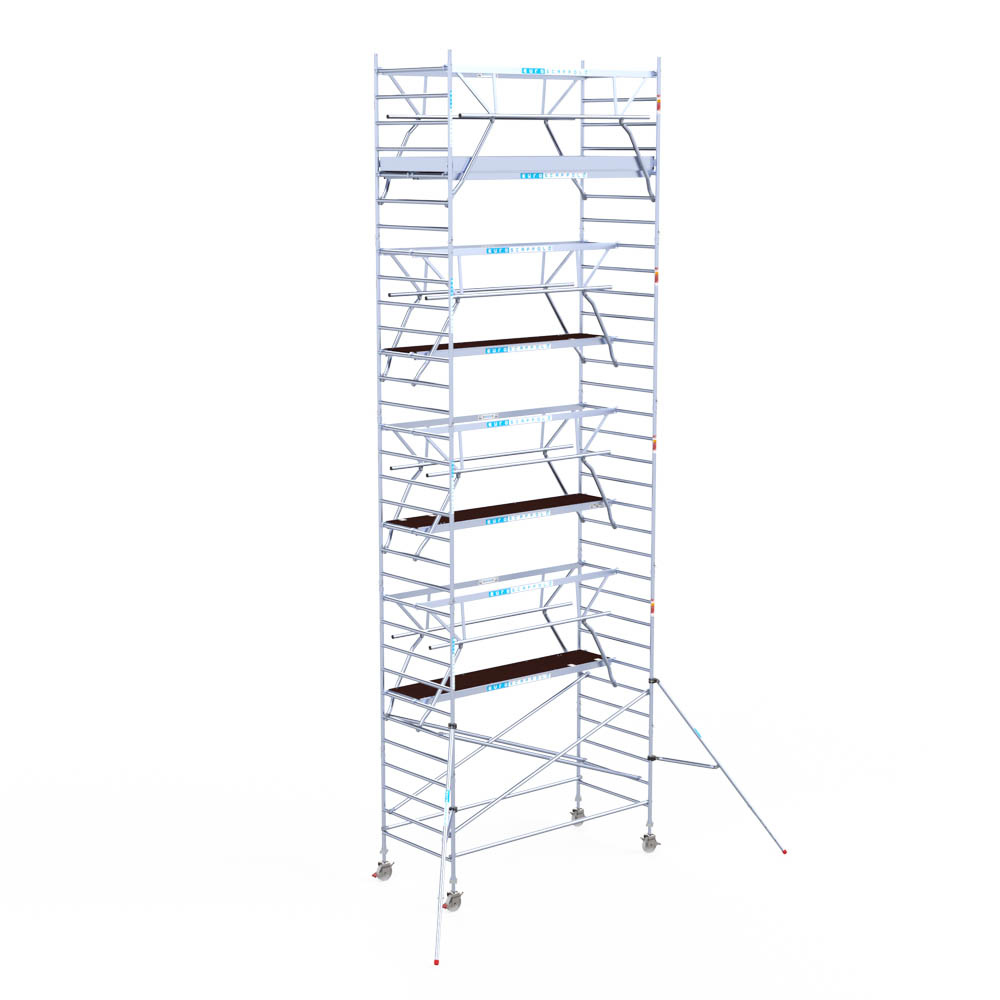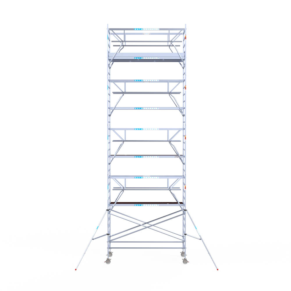 Let wel; Door de vernieuwde EN 1004 norm en het A-blad rolsteigers voldoen de Euroscaffold Euro met enkel schoren zonder voorloopleuning niet meer aan de regelgeving voor zakelijk gebruik. De Euro uitvoering met voorloopleuningen voldoen hier wel aan. Voor particulier gebruik is de uitvoering met schoren wel voldoende.