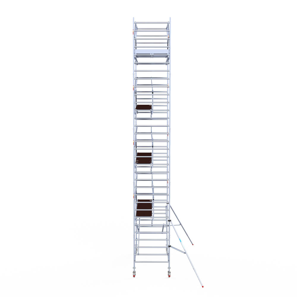 Deze rolsteiger heeft een steigerbreedte van 135, wat voor stabiliteit en stevigheid zorgt. De platformlengte is 305, wat voldoende werkruimte biedt. De werkhoogte van de rolsteiger is 10,2, waardoor je veilig op de gewenste hoogte kunt werken.