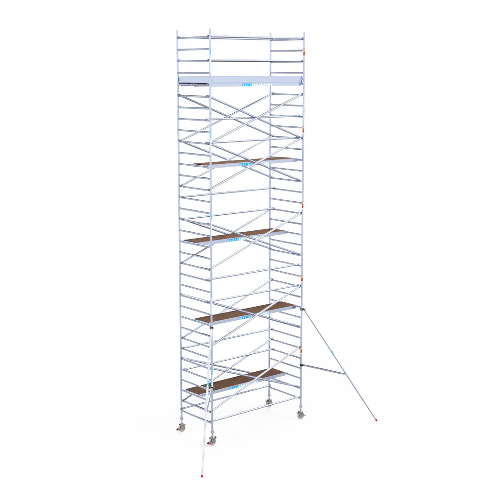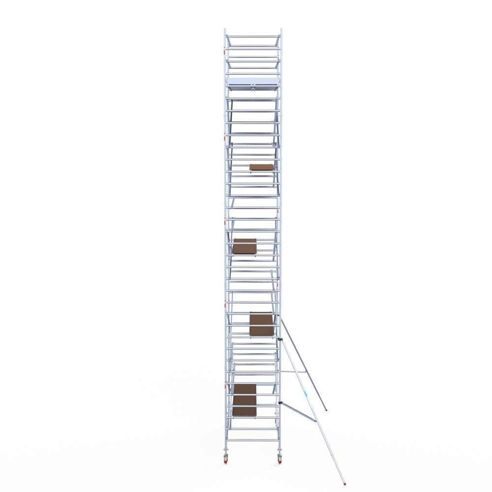 Deze rolsteiger heeft een steigerbreedte van 135, wat voor stabiliteit en stevigheid zorgt. De platformlengte is 305, wat voldoende werkruimte biedt. De werkhoogte van de rolsteiger is 11,2, waardoor je veilig op de gewenste hoogte kunt werken.