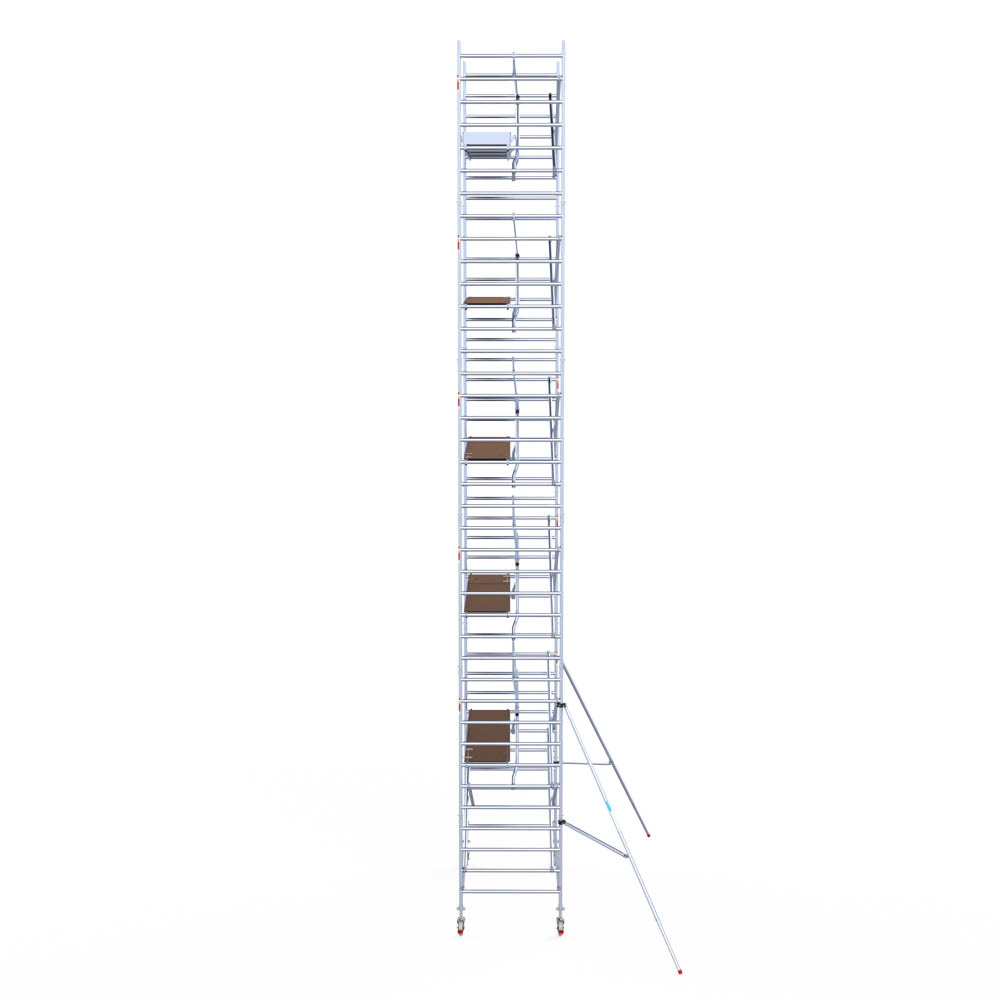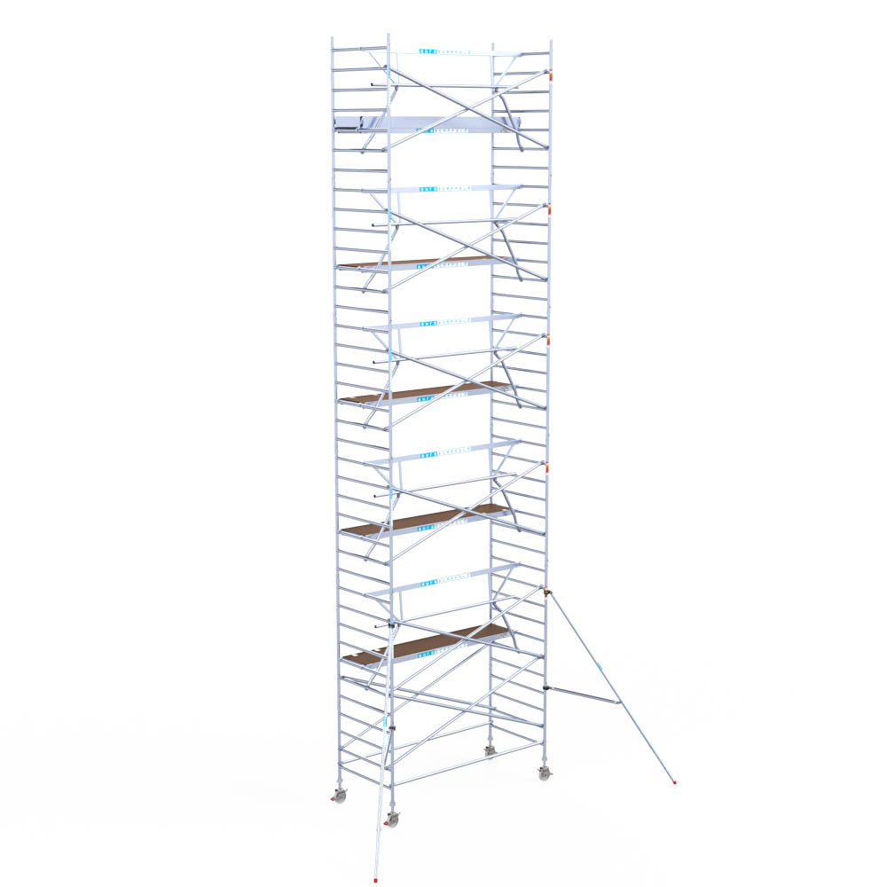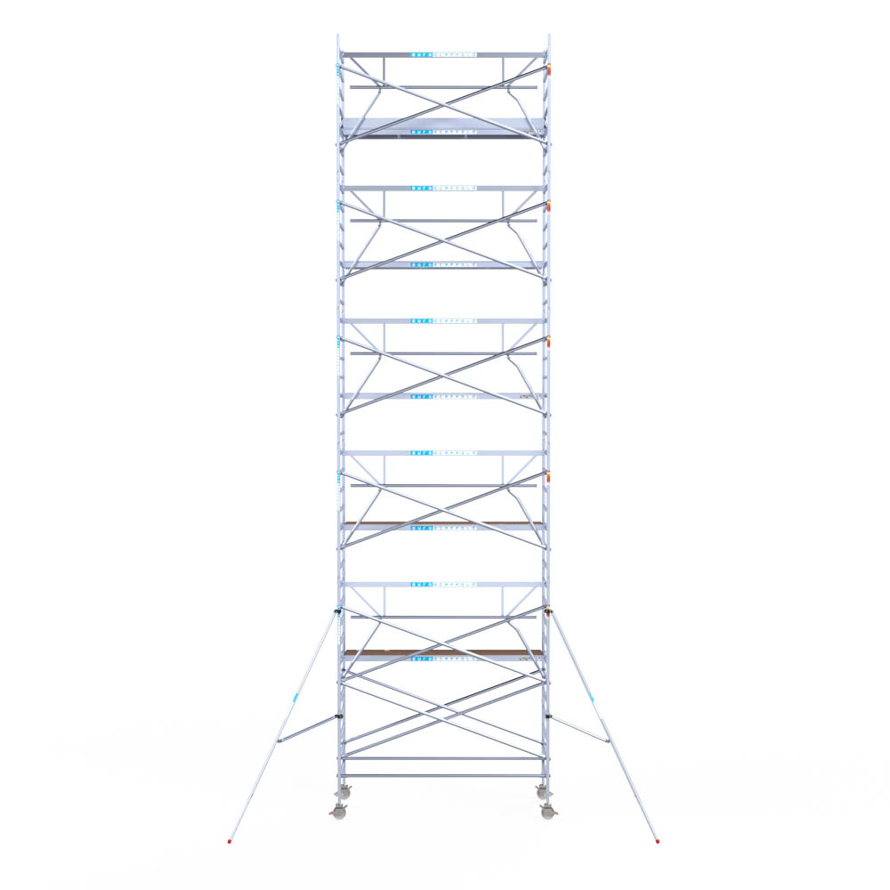 Let wel; Door de vernieuwde EN 1004 norm en het A-blad rolsteigers voldoen de Euroscaffold Euro met enkel schoren zonder voorloopleuning niet meer aan de regelgeving voor zakelijk gebruik. De Euro uitvoering met voorloopleuningen voldoen hier wel aan. Voor particulier gebruik is de uitvoering met schoren wel voldoende.