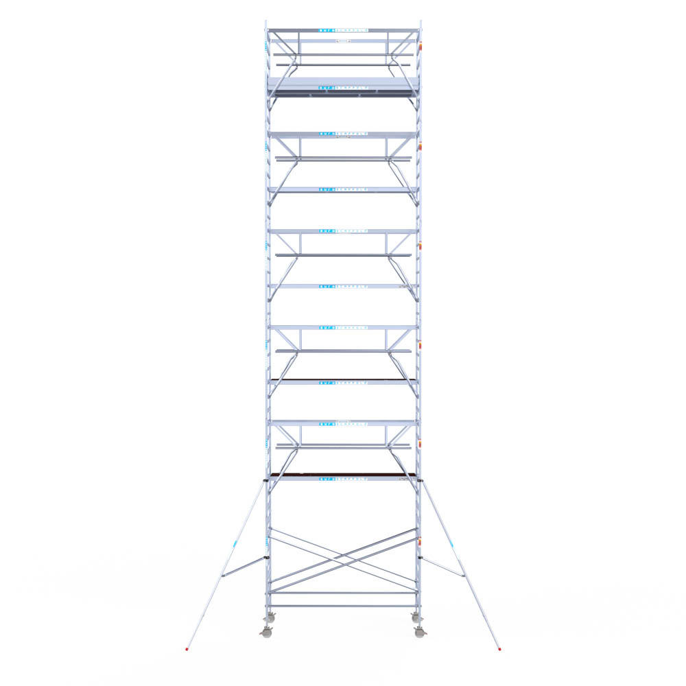 Let wel; Door de vernieuwde EN 1004 norm en het A-blad rolsteigers voldoen de Euroscaffold Euro met enkel schoren zonder voorloopleuning niet meer aan de regelgeving voor zakelijk gebruik. De Euro uitvoering met voorloopleuningen voldoen hier wel aan. Voor particulier gebruik is de uitvoering met schoren wel voldoende.