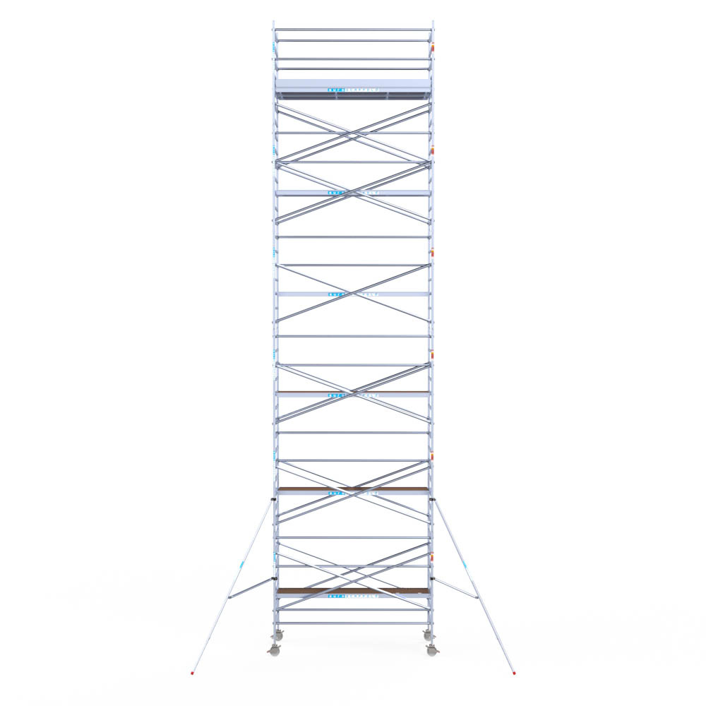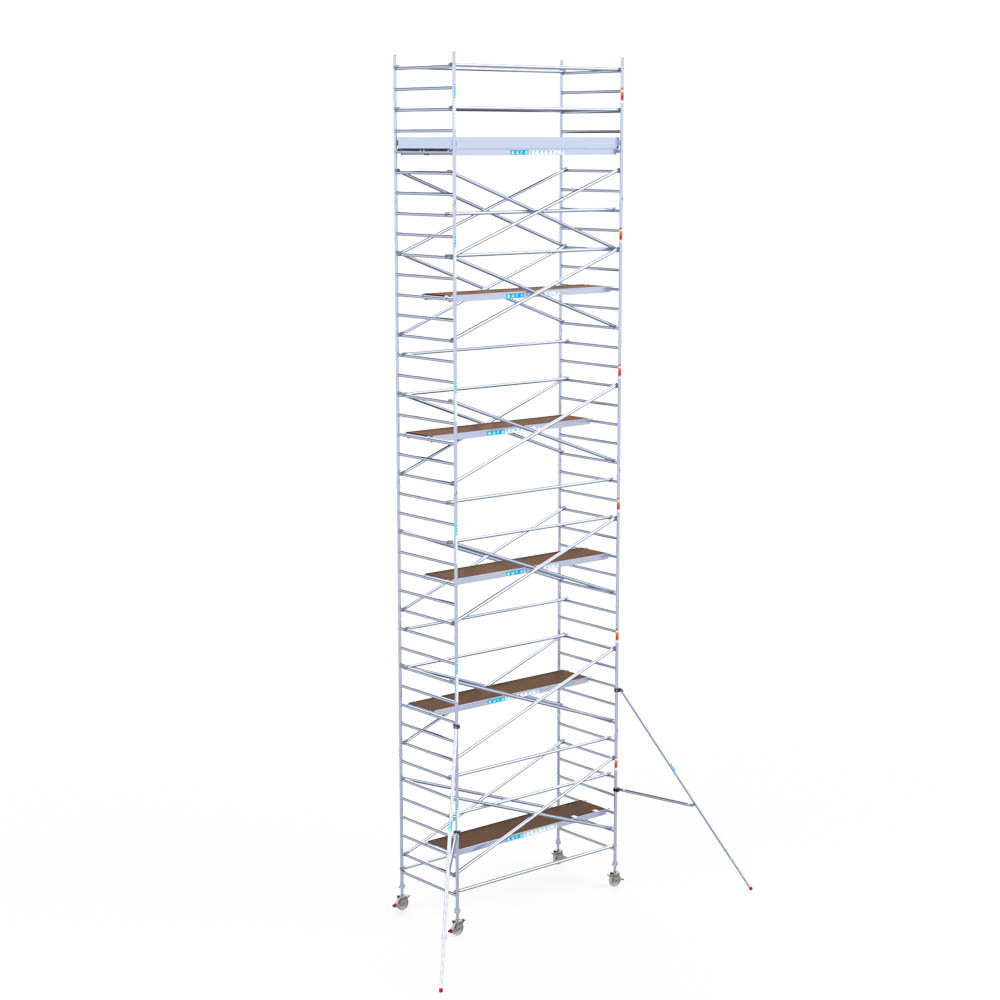 Let wel; Door de vernieuwde EN 1004 norm en het A-blad rolsteigers voldoen de Euroscaffold Euro met enkel schoren zonder voorloopleuning niet meer aan de regelgeving voor zakelijk gebruik. De Euro uitvoering met voorloopleuningen voldoen hier wel aan. Voor particulier gebruik is de uitvoering met schoren wel voldoende.