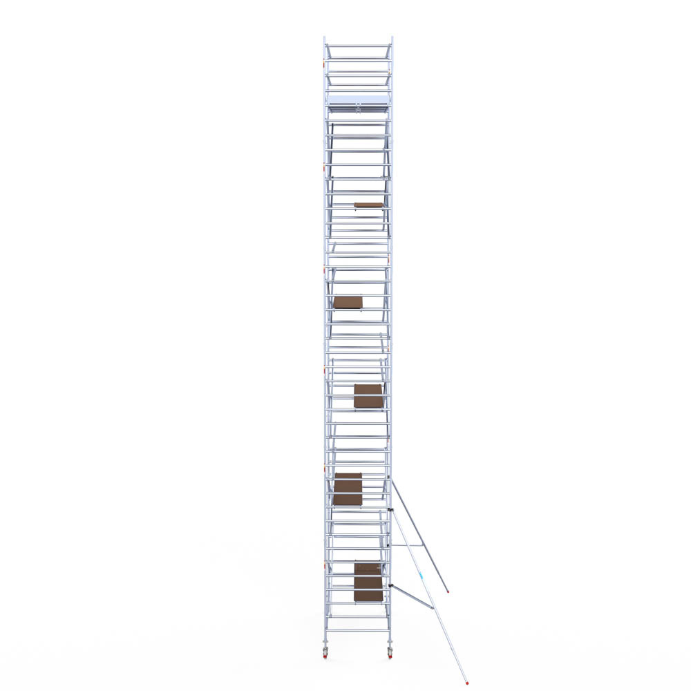 Deze rolsteiger heeft een steigerbreedte van 135, wat voor stabiliteit en stevigheid zorgt. De platformlengte is 305, wat voldoende werkruimte biedt. De werkhoogte van de rolsteiger is 13,2, waardoor je veilig op de gewenste hoogte kunt werken.
