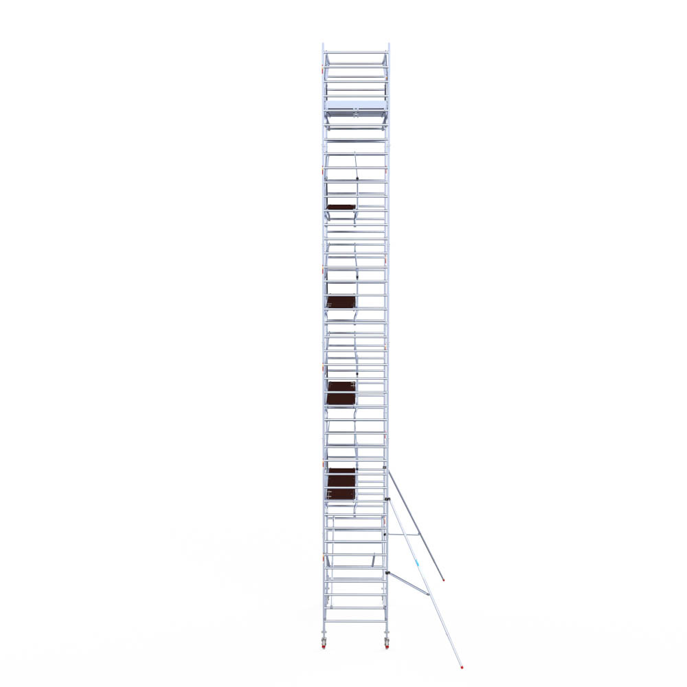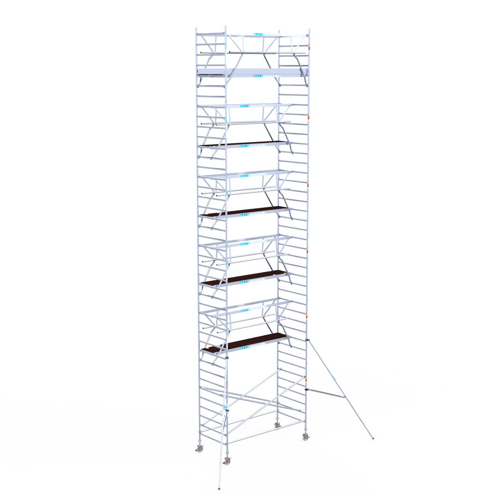 Deze rolsteiger heeft een steigerbreedte van 135, wat voor stabiliteit en stevigheid zorgt. De platformlengte is 305, wat voldoende werkruimte biedt. De werkhoogte van de rolsteiger is 13,2, waardoor je veilig op de gewenste hoogte kunt werken.