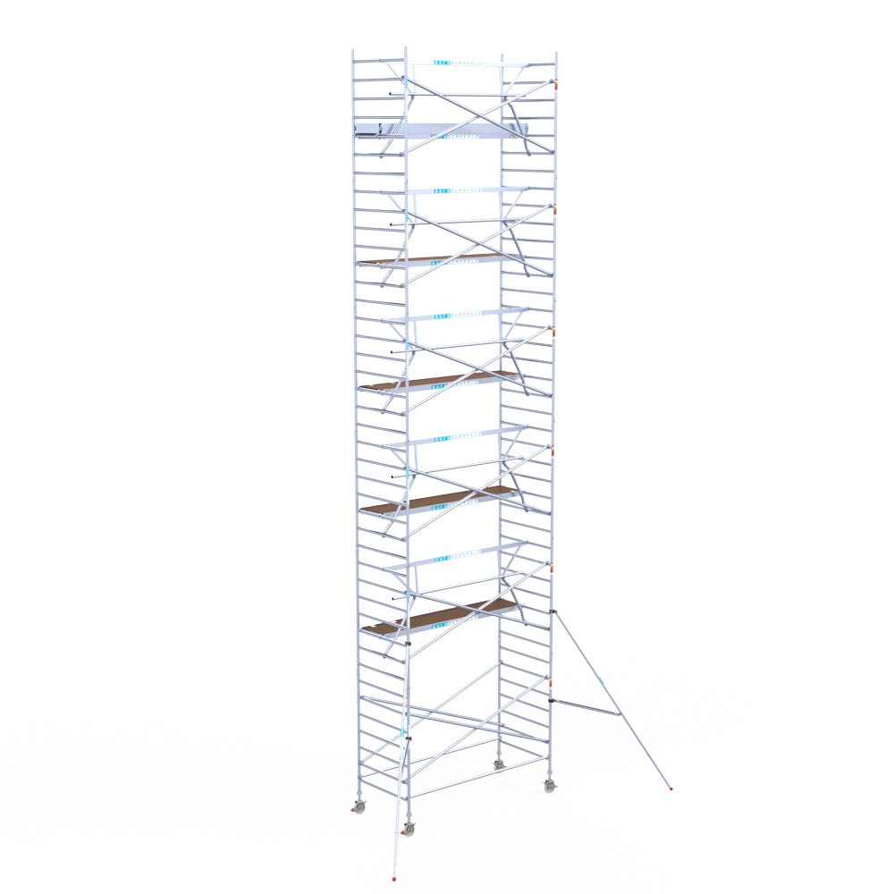 Deze rolsteiger heeft een steigerbreedte van 135, wat voor stabiliteit en stevigheid zorgt. De platformlengte is 305, wat voldoende werkruimte biedt. De werkhoogte van de rolsteiger is 13,2, waardoor je veilig op de gewenste hoogte kunt werken.