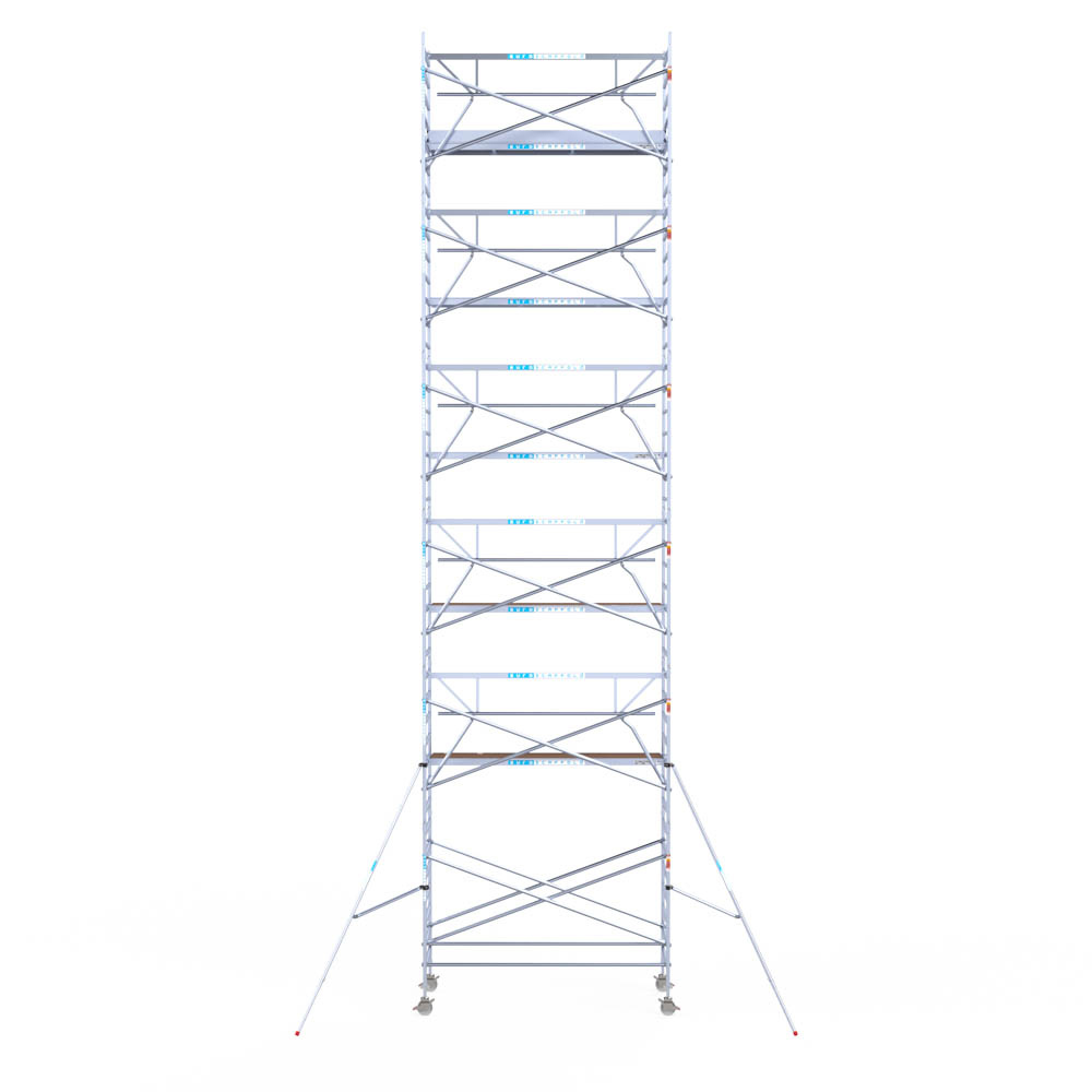 Let wel; Door de vernieuwde EN 1004 norm en het A-blad rolsteigers voldoen de Euroscaffold Euro met enkel schoren zonder voorloopleuning niet meer aan de regelgeving voor zakelijk gebruik. De Euro uitvoering met voorloopleuningen voldoen hier wel aan. Voor particulier gebruik is de uitvoering met schoren wel voldoende.