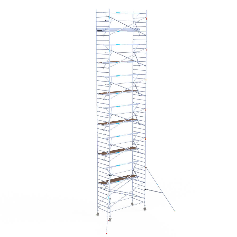 Deze rolsteiger heeft een steigerbreedte van 135, wat voor stabiliteit en stevigheid zorgt. De platformlengte is 305, wat voldoende werkruimte biedt. De werkhoogte van de rolsteiger is 14,2, waardoor je veilig op de gewenste hoogte kunt werken.