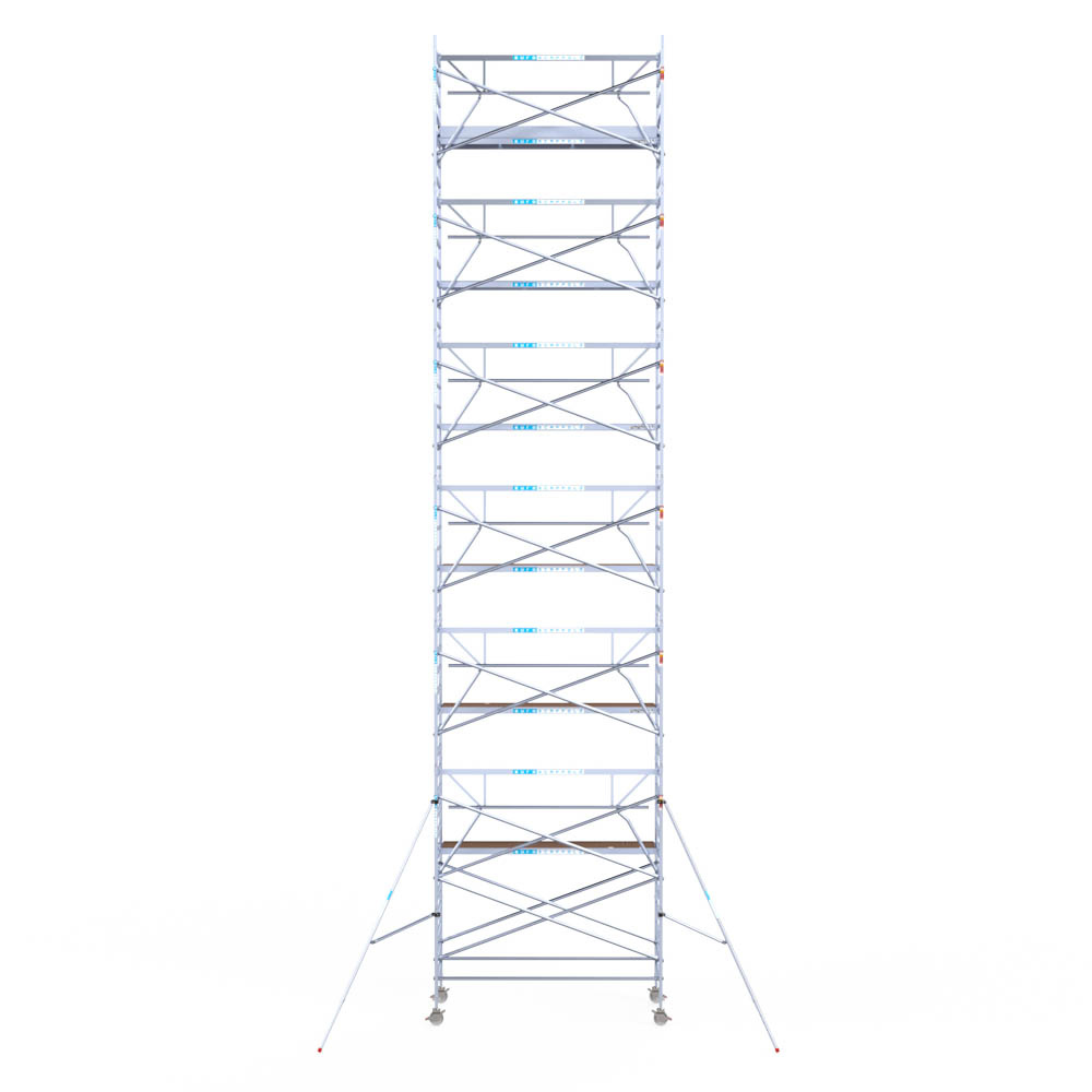Let wel; Door de vernieuwde EN 1004 norm en het A-blad rolsteigers voldoen de Euroscaffold Euro met enkel schoren zonder voorloopleuning niet meer aan de regelgeving voor zakelijk gebruik. De Euro uitvoering met voorloopleuningen voldoen hier wel aan. Voor particulier gebruik is de uitvoering met schoren wel voldoende.