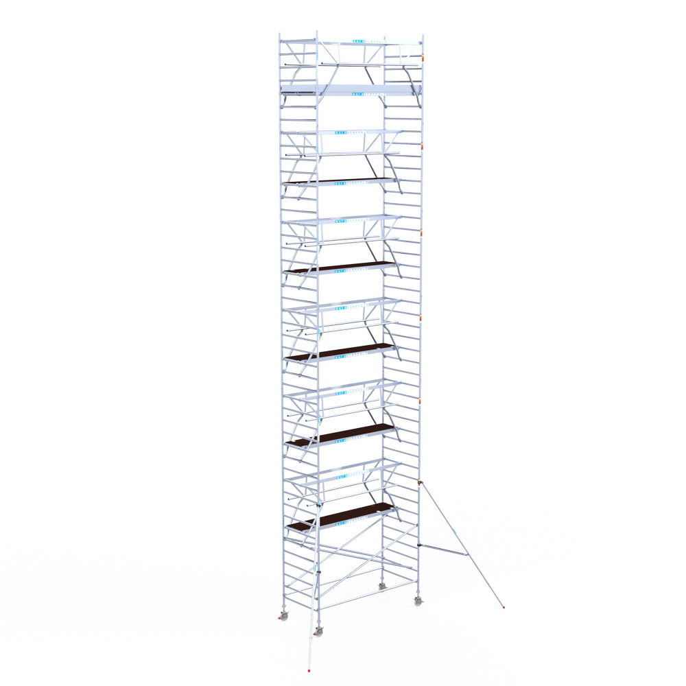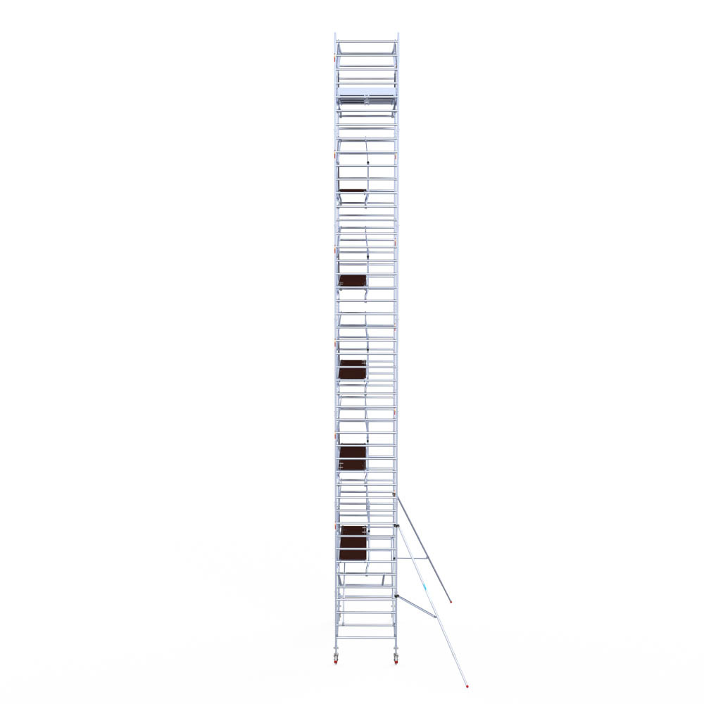Deze rolsteiger heeft een steigerbreedte van 135, wat voor stabiliteit en stevigheid zorgt. De platformlengte is 305, wat voldoende werkruimte biedt. De werkhoogte van de rolsteiger is 14,2, waardoor je veilig op de gewenste hoogte kunt werken.