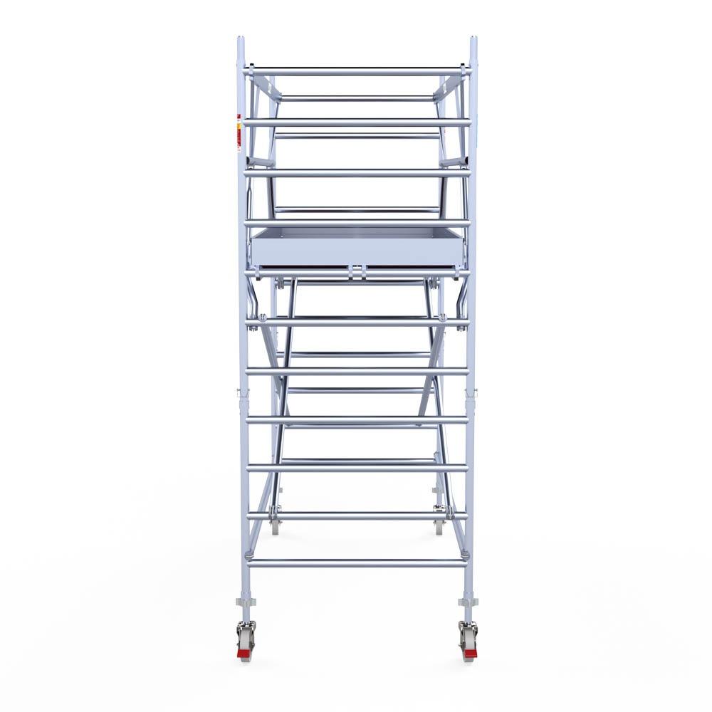 Deze rolsteiger heeft een steigerbreedte van 135, wat voor stabiliteit en stevigheid zorgt. De platformlengte is 305, wat voldoende werkruimte biedt. De werkhoogte van de rolsteiger is 4,2, waardoor je veilig op de gewenste hoogte kunt werken.