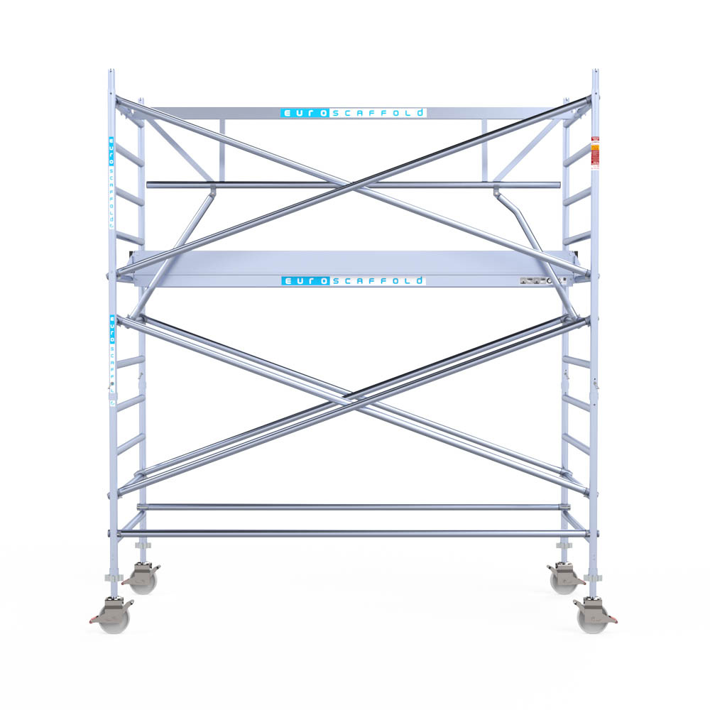 Let wel; Door de vernieuwde EN 1004 norm en het A-blad rolsteigers voldoen de Euroscaffold Euro met enkel schoren zonder voorloopleuning niet meer aan de regelgeving voor zakelijk gebruik. De Euro uitvoering met voorloopleuningen voldoen hier wel aan. Voor particulier gebruik is de uitvoering met schoren wel voldoende.