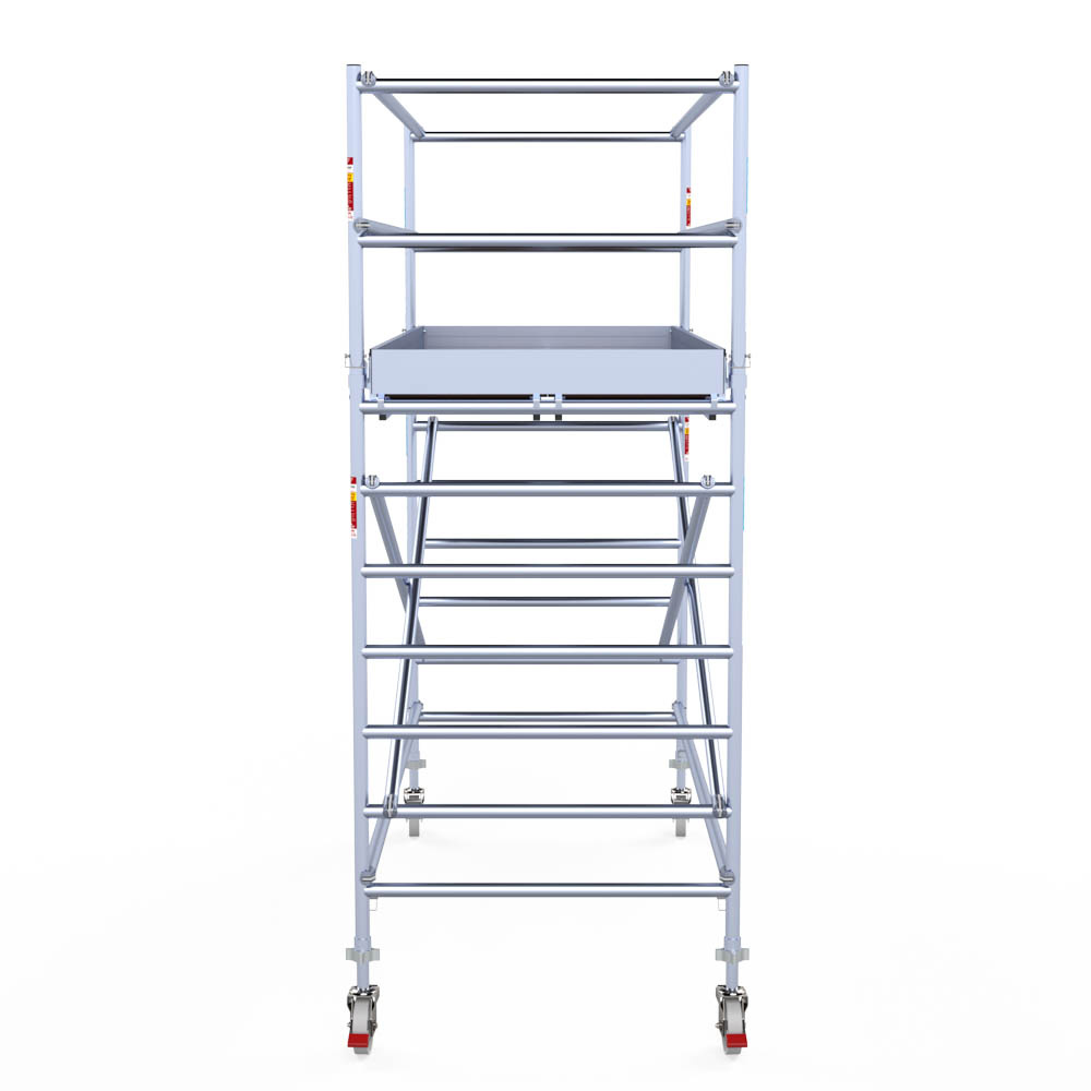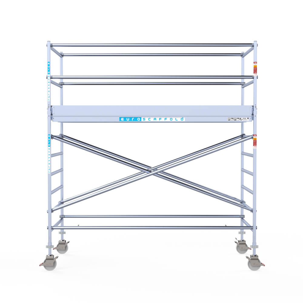Let wel; Door de vernieuwde EN 1004 norm en het A-blad rolsteigers voldoen de Euroscaffold Euro met enkel schoren zonder voorloopleuning niet meer aan de regelgeving voor zakelijk gebruik. De Euro uitvoering met voorloopleuningen voldoen hier wel aan. Voor particulier gebruik is de uitvoering met schoren wel voldoende.